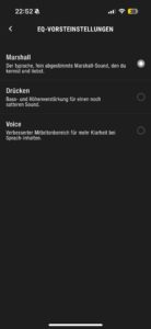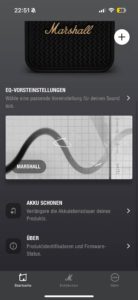 In der Marshall App für Android oder iOS gibt es einen Equalizer mit drei Presets, eine ausgefeilte Einstellungssektion zur Akkupflege und es lassen sich Updates anschubsen, wenn die App aktiv ist. Das ist eine überschaubare Anzahl an Funktionen und am meisten vermisse ich einen Abschalttimer – die Box ist always on.