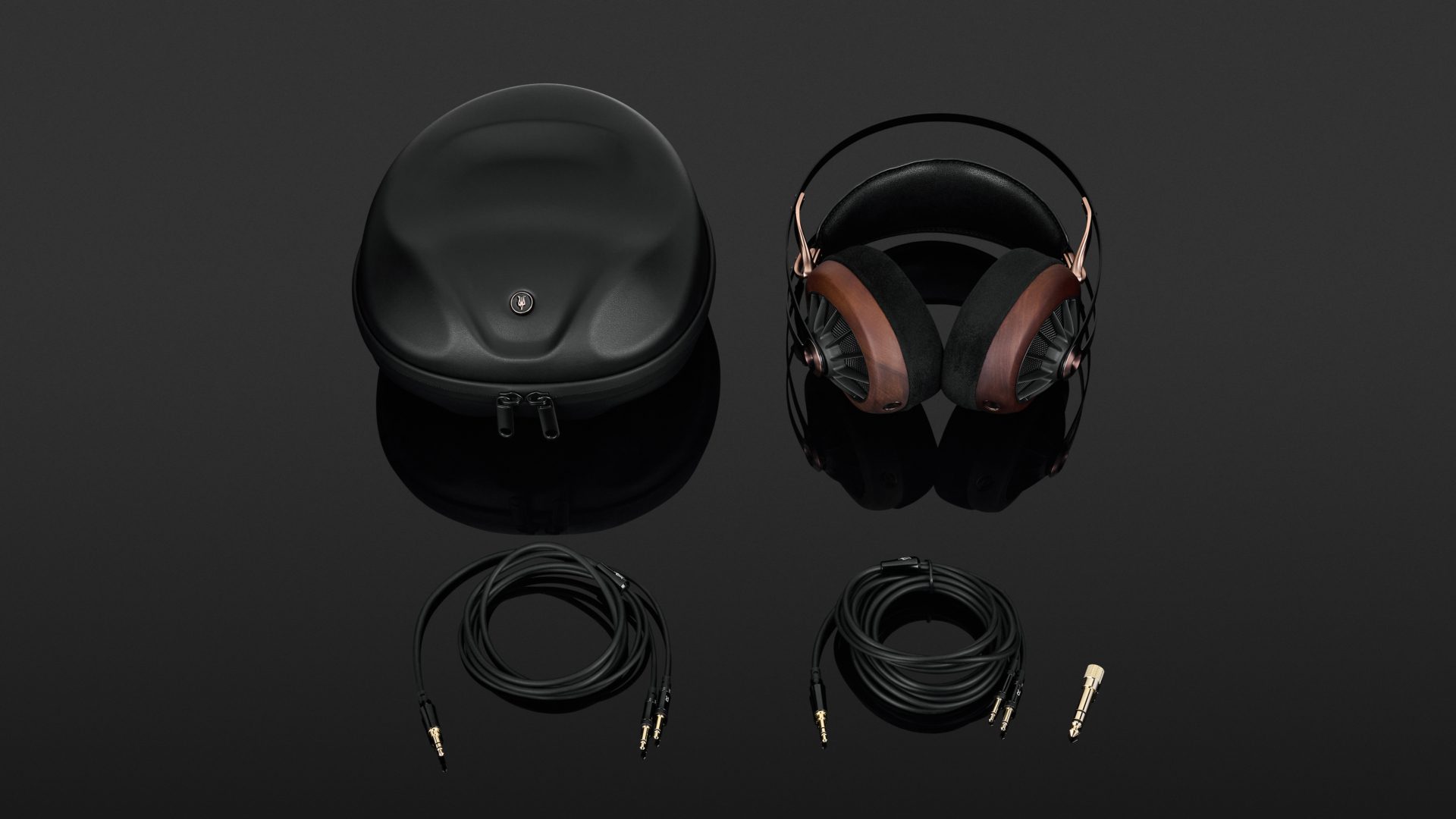 Der Meze Audio 109 Pro wird mitsamt seinem Zubehör in einem Karton mit Faltdeckel und Magnetverschluss geliefert. Darin befindet sich ein hochwertiges schwarzes Case, das den Kopfhörer bei Lagerung und Transport schützt. Das geschwungene Design und das auf der Oberseite des Cases angebrachte Emblem mit dem Hersteller-Logo sorgen für einen echten Hingucker. Das Case ist von innen mit Samtstoff ausgeschlagenen.