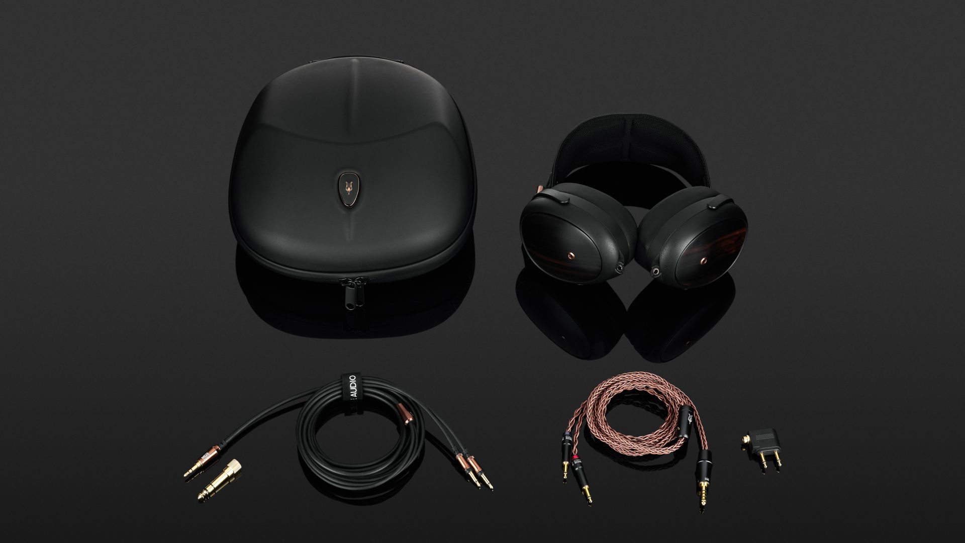 Das Case wird per Doppelreißverschluss geöffnet und hat innen ein Samtfutter, das die Case-Passform auskleidet. Darin liegen der Kopfhörer sowie ein schwarzer Kunstlederbeutel mit Kordelzug. Er beherbergt die Wechselkabel und Adapter des Liric. Dabei handelt es sich zum einen um ein handgeflochtenes, gewendeltes PCUHD-Kupferkabel von Furukawa mit 137 cm Länge und Pentaconn-Klinkenstecker im 4,4-mm-Format. Mit diesem Kabel kann der Kopfhörer an hochwertige mobile Kopfhörerverstärker angeschlossen werden.