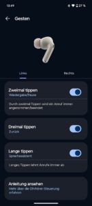 Die Steuerung ist allerdings zunächst gewöhnungsbedürftig. Wichtig zu wissen ist, dass ein Tippen der Fingerspitzen selten zum Erfolg führt, stattdessen tappt man mit der ganzen Fingerkuppe auf den Stiel. Daher unterstützen die Moto Buds+ auch keinen Einfach-, sondern ausschließlich Doppel- und Dreifach-Taps sowie Drücken-und-Halten. Beide In-Ears lassen sich per App unabhängig voneinander mit Befehlen belegen. Gerade die Dreifach-Tabs gelingen aber nicht zuverlässig. Da erscheint uns die ausschließlich drucksensitive Bedienung der Apple AirPods Pro 2 bequemer, da sie Fehleingaben noch weiter reduziert. Genauso wie bei den Bose QuietComfort Ultra Earbuds oder Bose QuietComfort Earbuds II gibts per App gar nicht so viel einzustellen – Konfigurationswunder sind also die Moto Buds+ auch nicht.