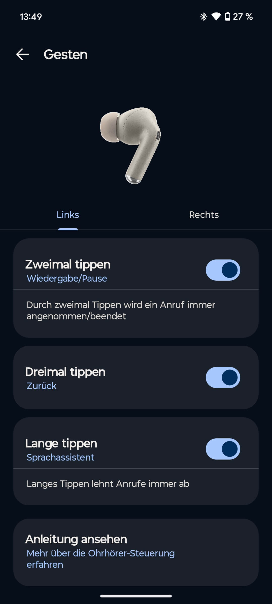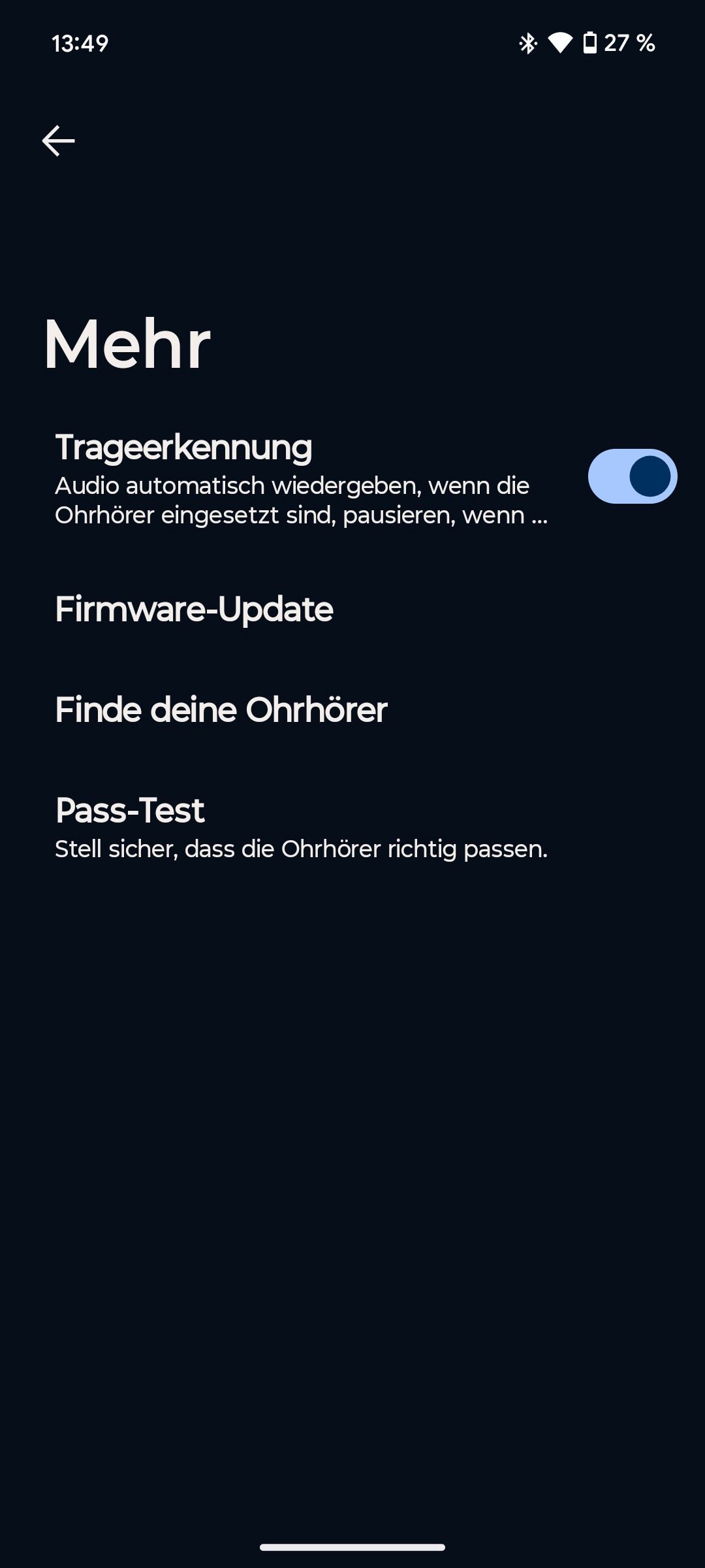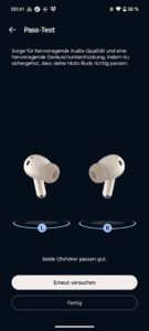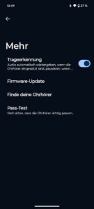 Einen Gaming-Modus gibts auch, der die Latenz (Versatz) zwischen Bild und Ton reduziert. Auto-Pause kann hier de-/aktiviert werden, ein Pass-Test überprüft, ob die In-Ears ordentlich sitzen, und eine Kopfhörer-Finden-funktion sucht bei Verlust per Piep-Ton nach den Ohrbeschallern.