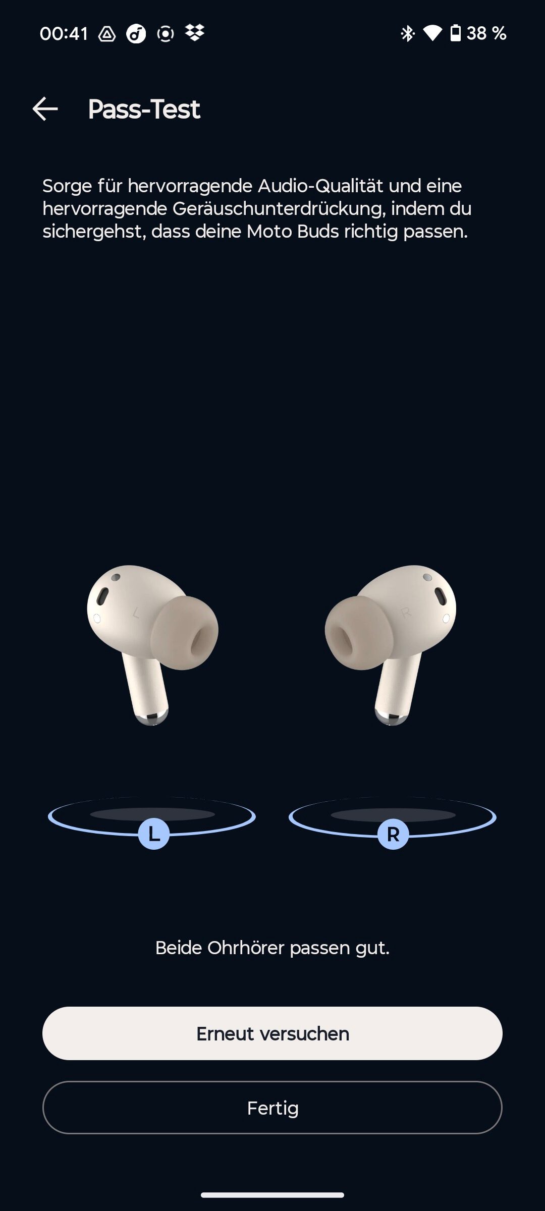 Die In-Ears selbst sehen den AirPods verdammt ähnlich. Und tragen sich auch so. Der vordergründigste Unterschied ist das matte Gehäuse, das so für Griffigkeit sorgt und dadurch besser in meinen Ohren hält. Wenn der Hersteller selbst schreibt, „die Moto Buds+ bieten das einzigartige Know-how von Bose für eine aktive Geräuschunterdrückung und EQ-Abstimmung“, lässt das aufhorchen. Bekommt man für gerade mal 120 Euro Straßenpreis also ein Premiumprodukt zum unteren Mittelklassepreis geliefert? Ach, haben wir bereits erwähnt, dass dazu sogar Hi-Res Audio und Dolby Atmos inklusive Headtracking serviert wird?