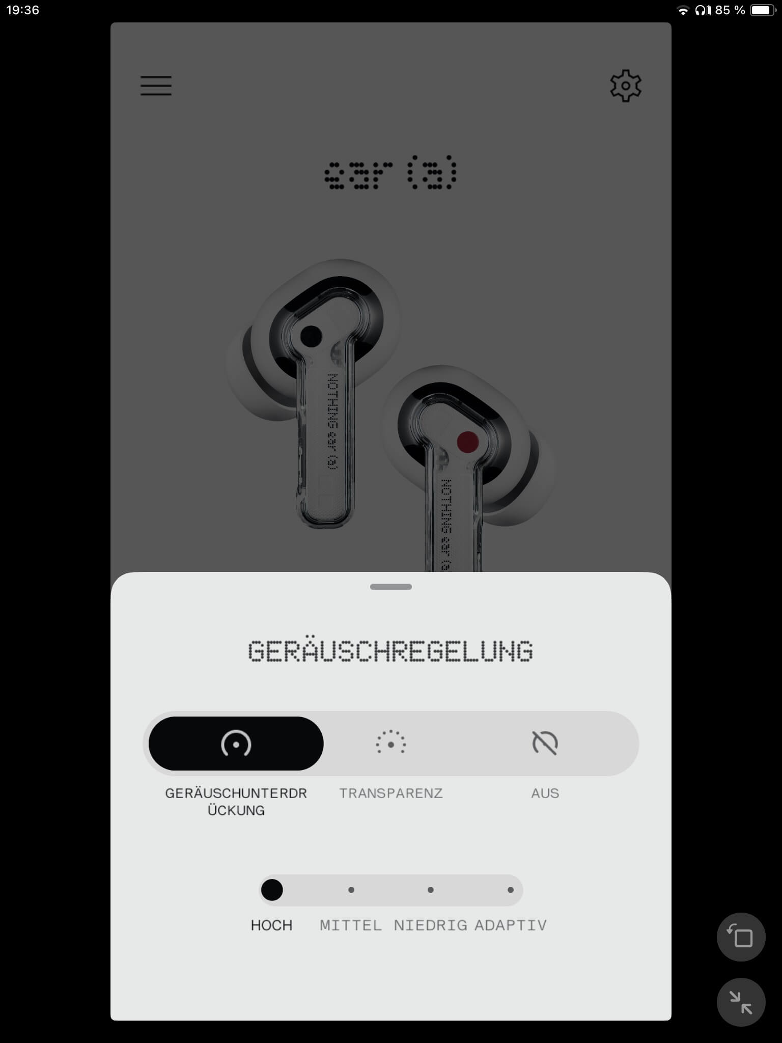 Die Geräuschregelung der App-Anbindung (Android und iOS) unterteilt sich in einen allgemeinen Transparenzmodus und mehrere Betriebsarten beim Noise Cancelling. Während zur manuellen Einstellung mit „Niedrig“, „Mittel“ und „Hoch“ drei statische ANC-Modi zur Auswahl stehen, passt sich die Geräuschunterdrückung bei der adaptiven Variante selbstständig an die Umgebung an.