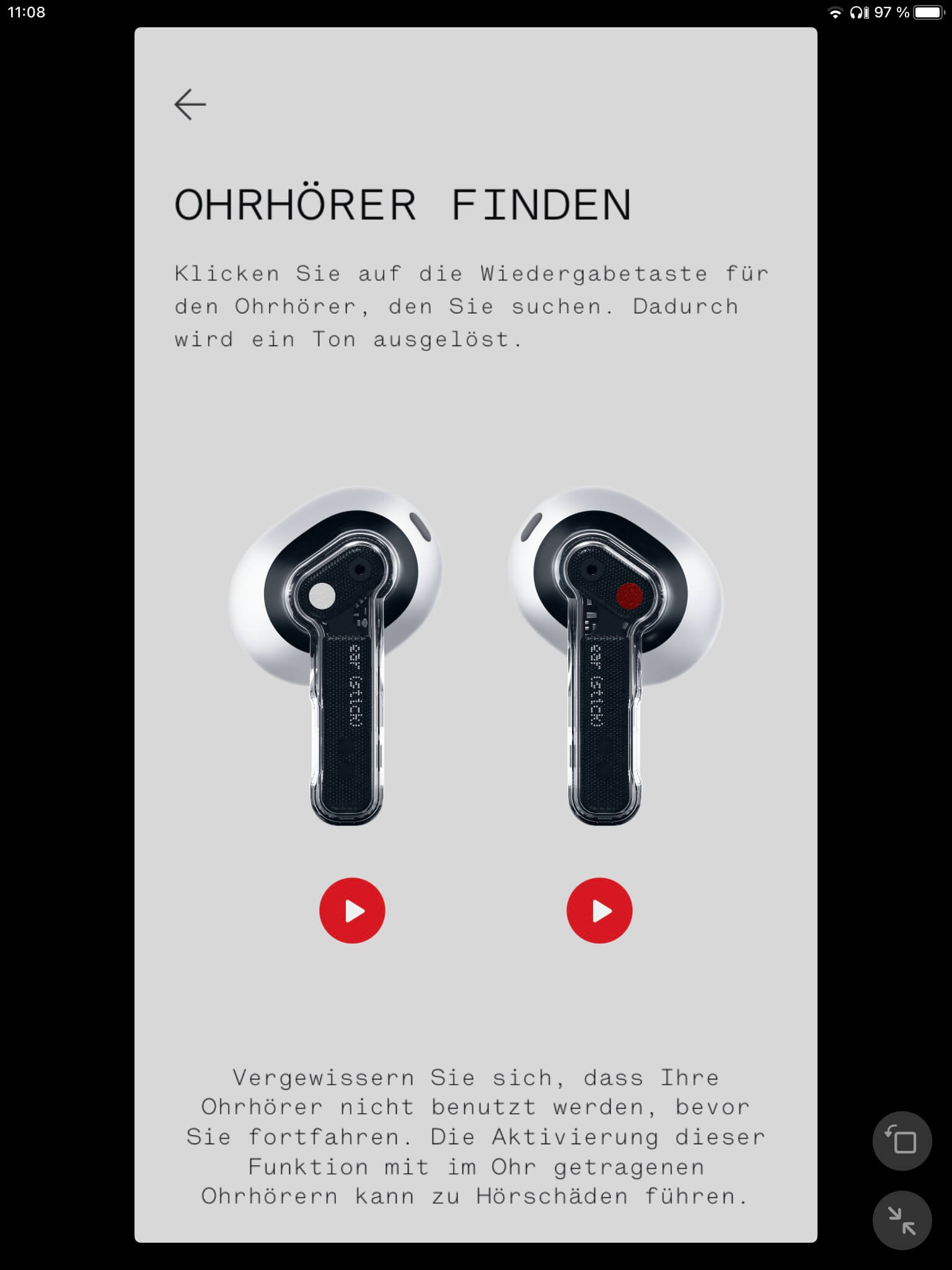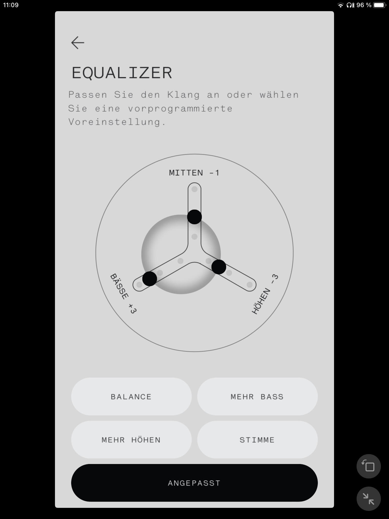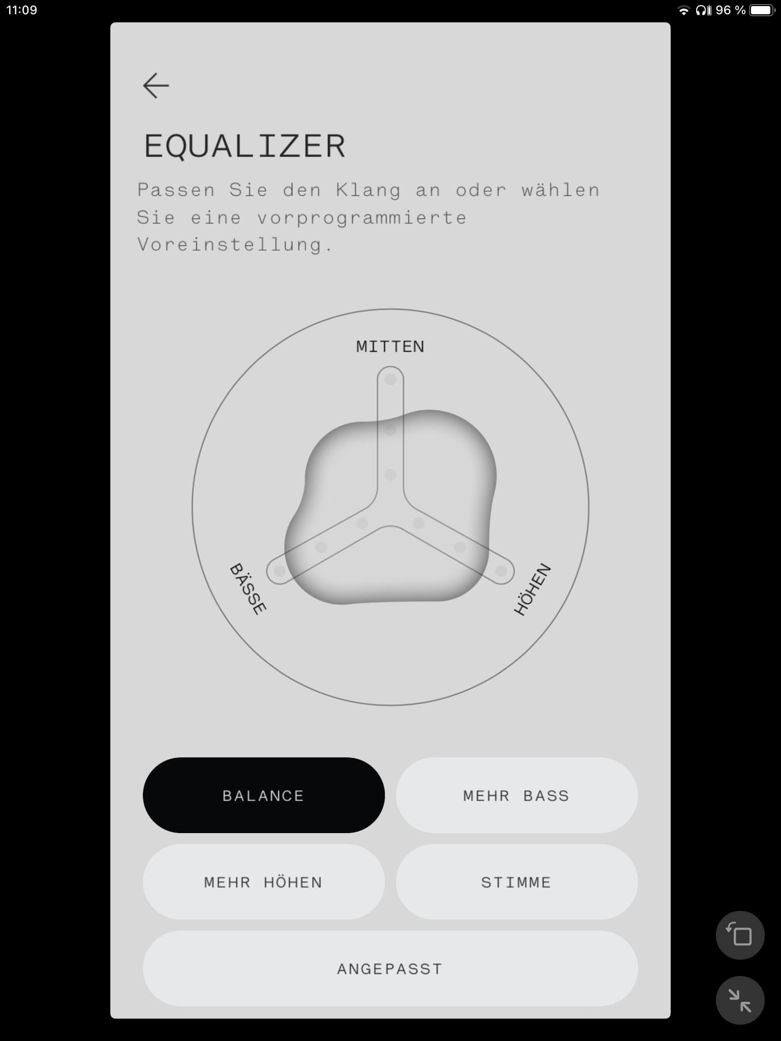 Wer ein Nothing Phone (1) nutzt, kann direkt auf die Hörereinstellungen zugreifen, was auf Android- und iOS-Geräten über die Nothing X-App möglich ist. Neben der Option die Remote zu konfigurieren, lassen sich ein Low-Latency-Modus und die Trageerkennung der Ear (stick) zum automatischen Pausieren der Wiedergabe beim Ablegen der Hörer (de-)aktivieren. Neben einer Akkustandsanzeige für Hörer und Case ist auch eine Suchfunktion vorhanden, die das Auffinden der Earbuds per Piepton erleichtern soll. Zur Klangregelung stehen darüber hinaus mit „Balance“, „Mehr Bass“, „Mehr Höhen“ und „Stimme“ vier vorkonfigurierte Modi zur Auswahl, während sich eigene Einstellungen über ein Diagramm mit drei Achsen für Bässe, Mitten und Höhen vornehmen lassen. Allerdings sind nicht mehrere User-Settings als Presets speicherbar, was eine wünschenswerte Funktionserweiterung darstellt. Abschließend sind per App noch Firmware-Aktualisierungen durchführbar.