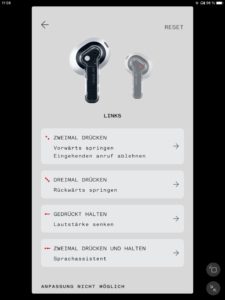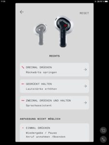 Besteht eine Funkverbindung, steuert einfaches Drücken die Wiedergabe und dient zum Annehmen sowie Beenden von Telefonaten. Diese Einstellung ist fix und kann nicht individualisiert werden, während die Gerätesteuerung ansonsten anpassbar ist. Ab Werk lässt sich durch ein Gedrückthalten die Lautstärke regulieren, welche linksseitig reduziert und über den rechten Hörer erhöht wird. Durch zweimaliges Drücken kann zudem zum nächsten Titel vor- und mithilfe eines dreifachen Drückens zurückgesprungen werden. Darüber hinaus ist der Sprachassistent nachrüstbar, der sich beispielsweise durch Drücken und ein anschließendes Halten aktivieren ließe, was insgesamt einwandfrei funktioniert.