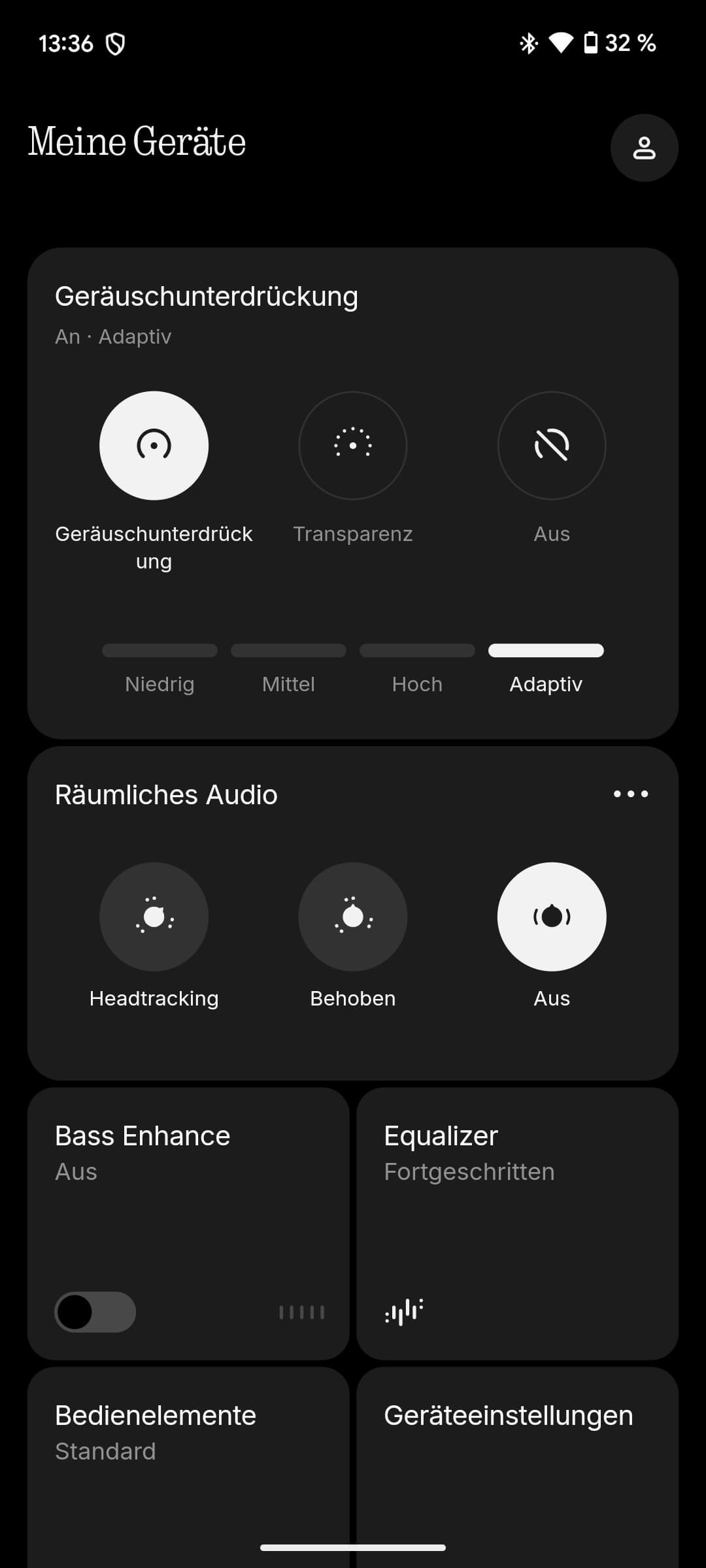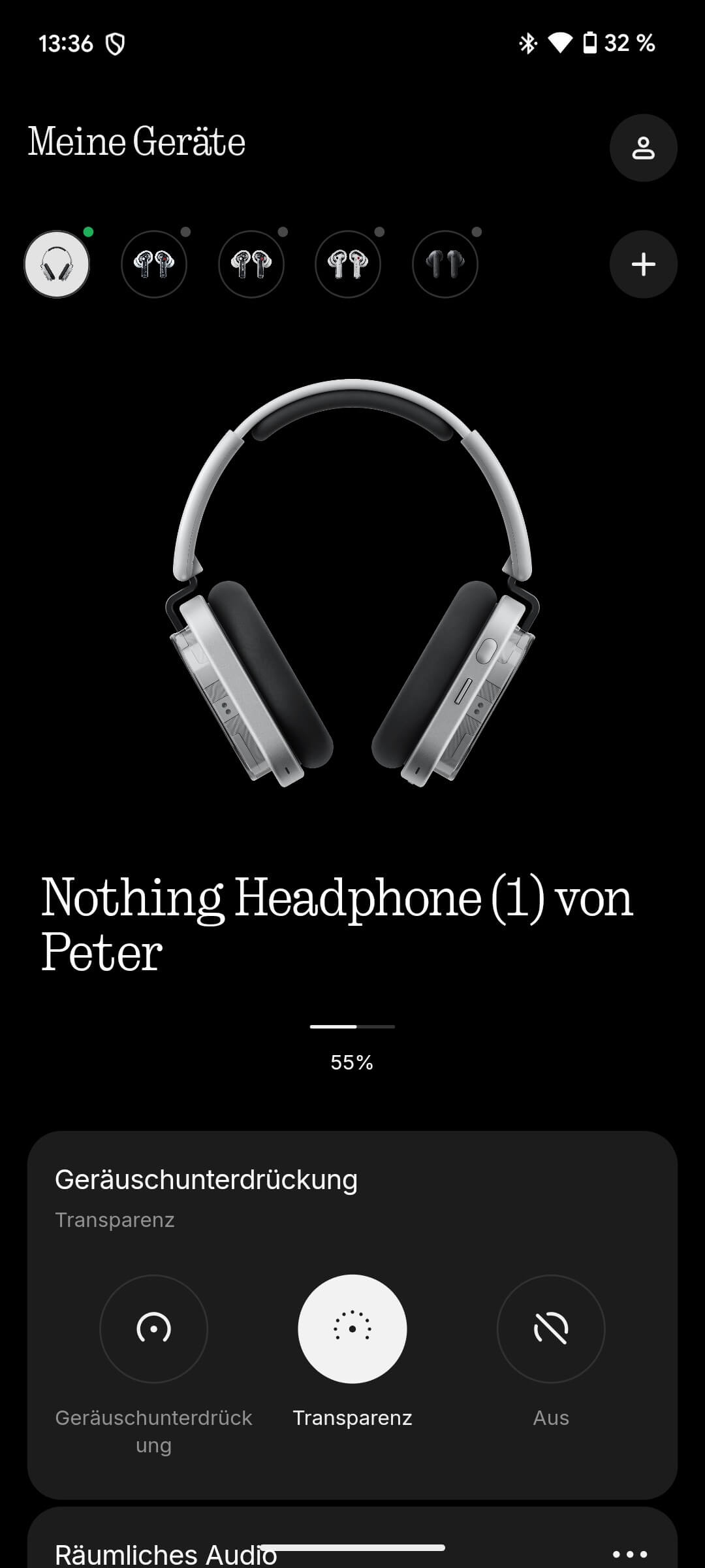 Im Test funktioniert das vierstufige ANC im öffentlichen Nahverkehr hervorragend – Motorengeräusche, Brummen und tiefe Frequenzen verschwinden fast vollständig. Auch Stimmen werden gut reduziert, wenn auch nicht vollständig eliminiert. Dabei hält sich das Grundrauschen zurück und ist nur bei absoluter Stille wahrnehmbar. Nothing beweist hier eindrucksvoll, dass hocheffizientes Noise Cancelling auch für unter 300 Euro möglich ist. Der direkte Vergleich mit den Apple AirPods Max oder Sony WH-1000XM6 zeigt leichte Unterschiede, wobei Nothing hier meiner Meinung nach nicht sonderlich schlechter filtert.