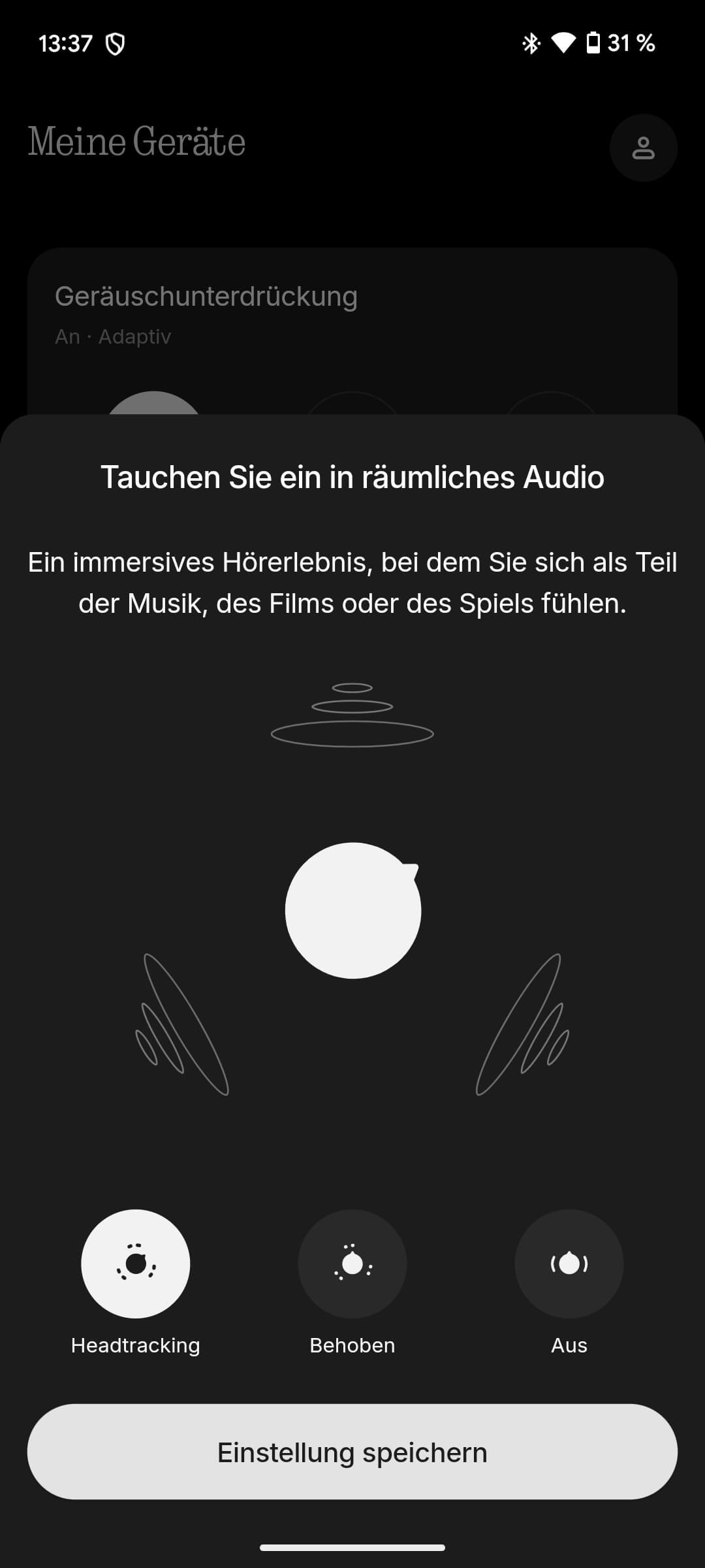 Die Spatial-Audio-Funktion mit Headtracking funktioniert gut – vor allem bei Filmen oder binauralen Aufnahmen. Es entsteht ein realistisch wirkendes Raumgefühl, das tatsächlich immersiver wirkt. Aber auch beim Nothing Headphone (1) müssen wir die berühmte Kirche im Dorf lassen: Die Lokalisation der Schallereignisse findet immer noch im Kopf und nicht wie bei Lautsprechern davor statt. Nothing positioniert also sein Spatial-Audio als universelle Betriebsart für Musik, Filme und Games – allerdings ohne Unterstützung für native Dolby-Atmos- oder 3D-Audio-Master. Das führt in der Praxis zu einer eher zweidimensionaleren Stereobreite: Klangobjekte wirken zwar etwas nach außen versetzt, doch es fehlt an Tiefenstaffelung.