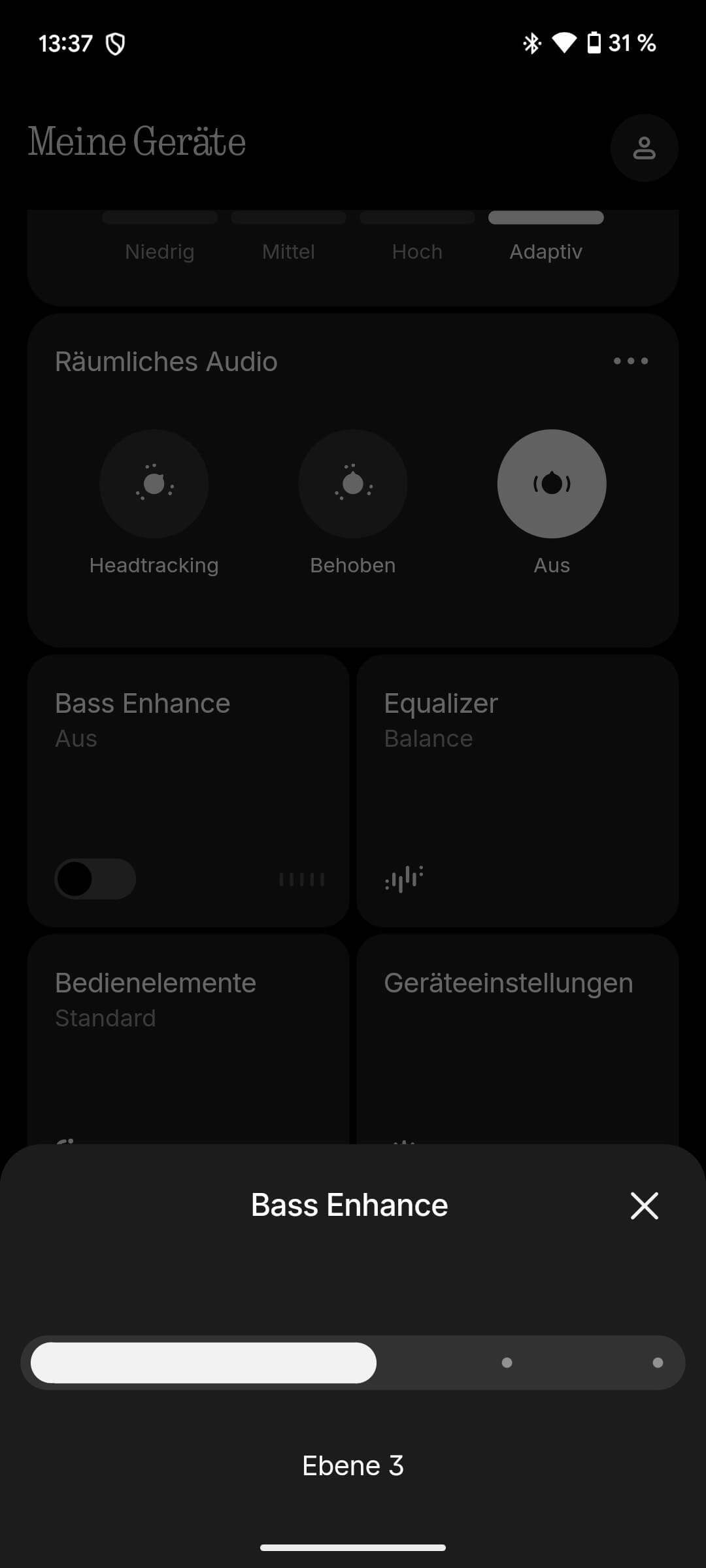 Im Hörtest fällt sofort auf: Der Klang ist recht ausgewogen, mit einem angenehmen Hang zur Wärme und Druck ohne überbordendes Bassgewitter. Egal ob klassische Musik, Podcasts, EDM oder akustische Gitarren – der Nothing (1) liefert eine natürlich warm wirkende Bühne mit erfassbarer Instrumententrennung und -staffelung, die allerdings für meinen Geschmack hätte breiter ausfüllen dürfen. Die Bässe reichen tief, wummern aber nie. Wer sich hier mehr Punch wünscht, kann per App mit „Bass Enhance“ den tiefen Frequenzen in fünf Schritten auf die Sprünge helfen.