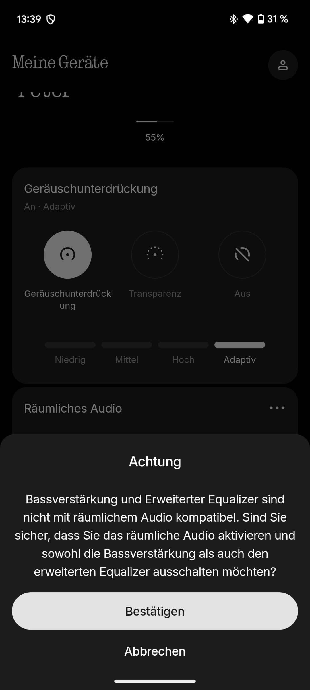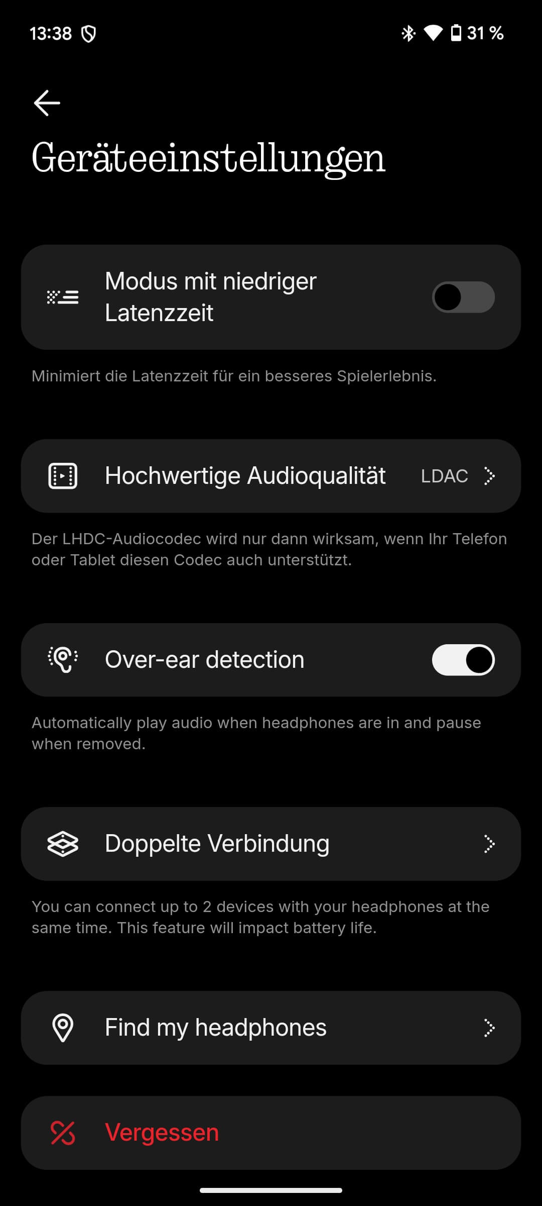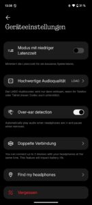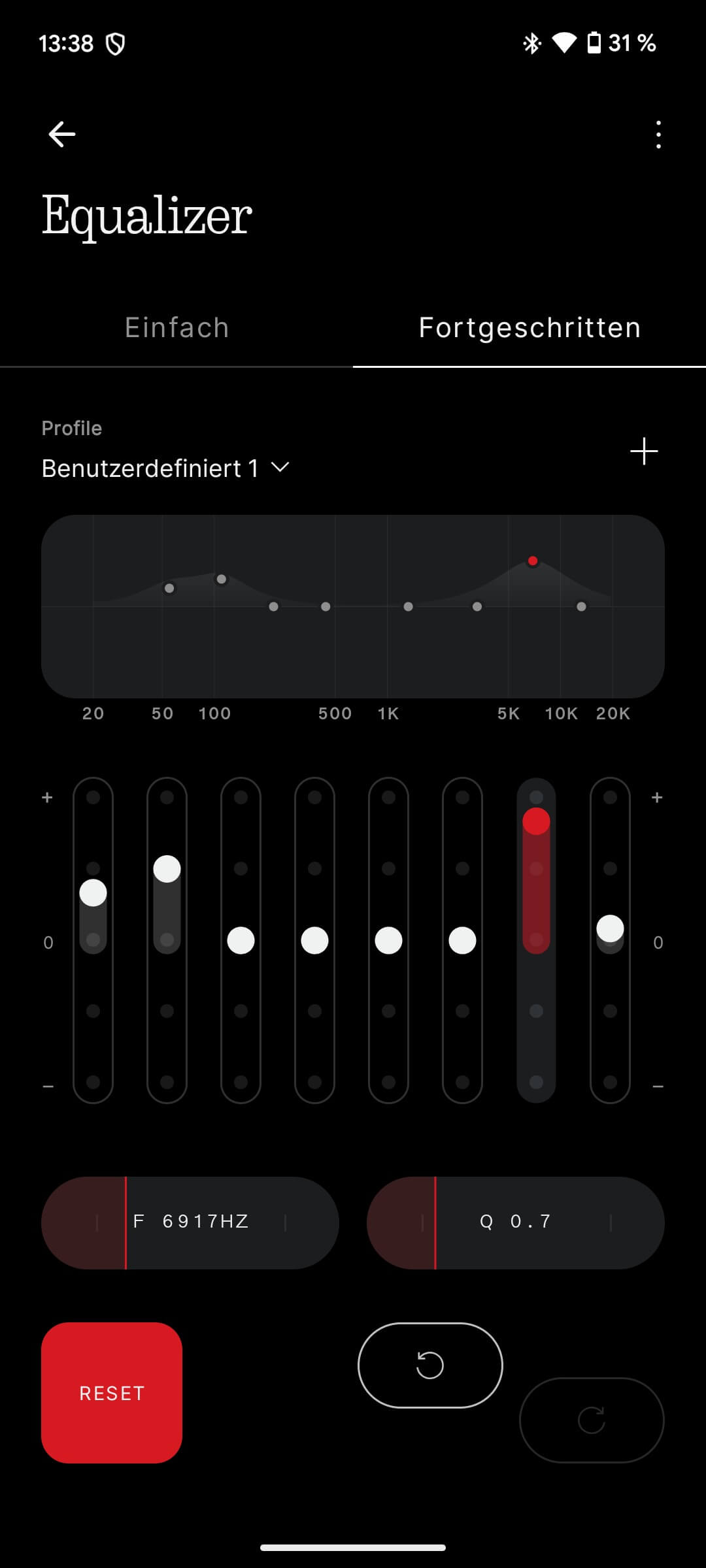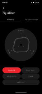 Ein Highlight aus klanglicher Sicht ist der Equalizer: Neben vier Presets („Balance“, „Mehr Bass“, „Mehr Höhen“, „Stimme“) könnt ihr im Modus „Einfach“ die Bässe, Mitten und Höhen in einem Kreis in jeweils 12 Schritten anheben, bzw. absenken. Wer detailliert eingreifen will, kann unter „Fortgeschritten“ dann eines der 8 Bänder sogar unter Berücksichtigung der Flankensteilheit bearbeiten. Gezielt einen extrem engen Frequenzbereich absenken, um scharfe S-Laute zu reduzieren? Kein Problem mit dem Nothing Headphone (1)! Im Equalizer lassen sich also feinste Nuancen abstimmen – deutlich besser als bei anderen Marken. Wer seine Presets teilen will, kann das tun. Wer einfach „Plug and Play“ will, kann sich auf die von KEF abgestimmten Profile verlassen.