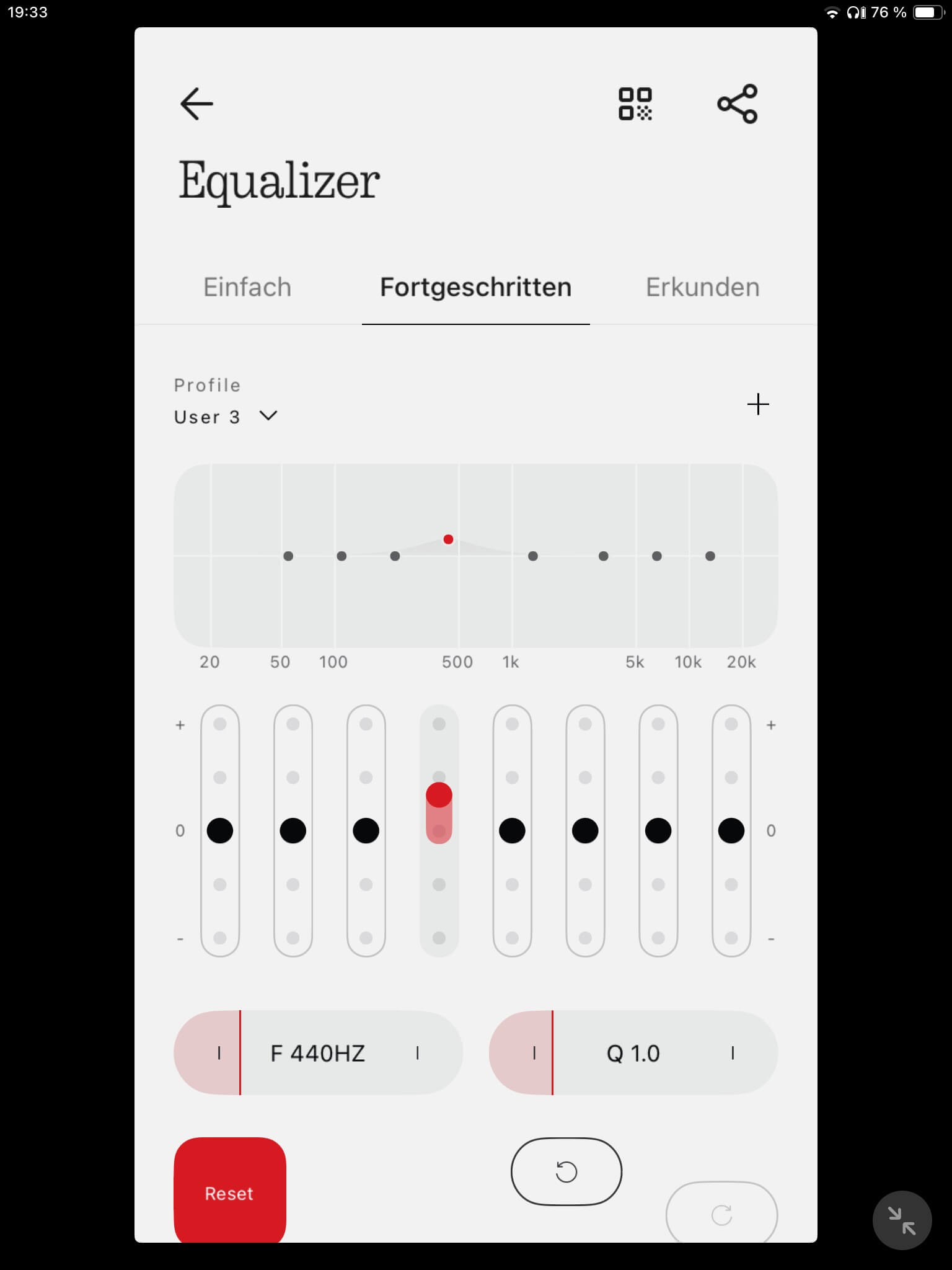 Mehrere Optionen bietet auch die Klangregelung durch einen „einfachen“ EQ mit drei Achsen und einen 8-Band-EQ für „fortgeschrittenes“ Soundtuning. Beim „einfachen“ EQ stehen mit „Balance“, „Mehr Bass“, was der Standardeinstellung entspricht, „Mehr Höhen“ und „Stimme“ vier Voreinstellungen zur Auswahl, wobei auch eine individuelle Einstellung vorgenommen werden kann.