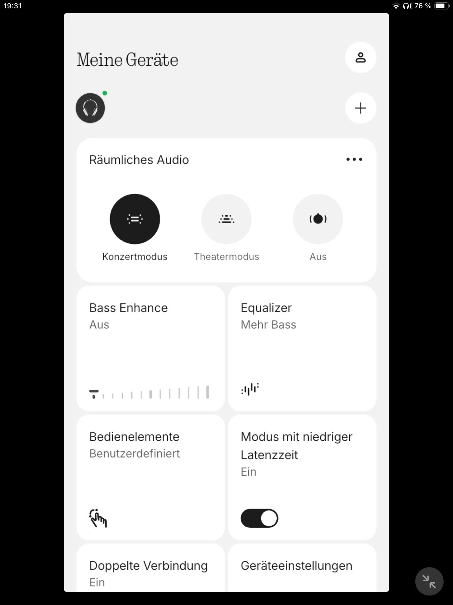 Für eine räumlichere Wiedergabe stehen mit dem Konzert- und Theatermodus zwei Optionen zur Wahl, und zwar statisch umgesetzt (ohne Headtracking). Dabei verlagert sich die virtuelle Bühne im Konzertmodus etwas tiefer in den Raum hinein, wodurch die Darstellung an Weite gewinnt und bei Live-Alben in der Tat mehr Konzertatmosphäre aufkommen lässt. Der Theatermodus soll hingegen die Klanglandschaft eines Kinos nachbilden, was bei actionreicher Filmkost aktuell jedoch zu Verzerrungen im Bassbereich führen kann.