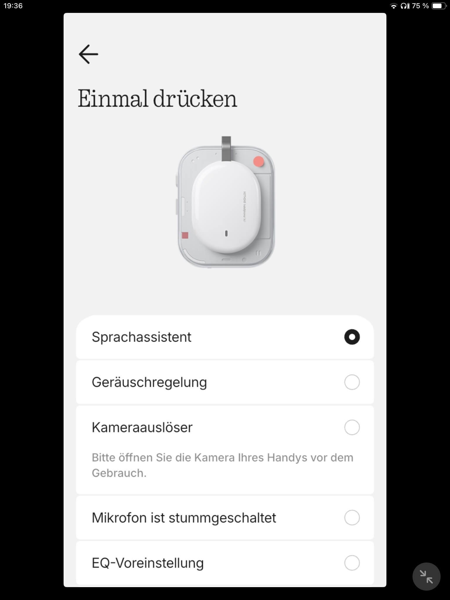 Das Paddle der Nothing Headphone (a) ist ebenfalls auf der horizontalen Ebene beweglich und dient zum Vor- oder Zurückspringen, kann bei vielen Medienplayern aber auch zum Spulen der Wiedergabeposition eingesetzt werden. Darüber hinaus lassen sich Anrufe abwickeln. Ergänzend kann der Taster zweifach belegt werden, um die Kamera vom Smartphone auszulösen, die Mikrofontechnik stumm zu schalten oder um durch die EQ-Voreinstellungen zu wechseln. Zuweisbar ist zudem der Sprachassistent, was unter Nothing OS auch eine Einbindung von ChatGPT ermöglicht, oder die Geräuschkontrolle. Ein kleiner, eingelassener Bluetooth-Taster auf der rechten Schaleninnenseite aktiviert außerdem bei Bedarf den Pairing-Modus.