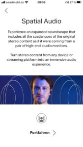 Mit der Spatial-Audio-Funktion lässt sich ein Algorithmus zur Klangverbesserung zuschalten. Technisch gesehen werden dabei sowohl die linken und rechten Stereokanäle in jeder Hörerseite bearbeitet, um eine Studioumgebung mit Monitoren zu simulieren, die unter anderem mit Übersprechen und ergänzenden Zeitkorrekturen agiert, die letztlich in eine realistischere Räumlichkeit münden sollen (Details im White Paper [engl.] auf www.dirac.com). Dabei soll sich die Klangwiedergabe nicht nur einem normalen Lautsprecher annähern, sondern auch zu einem Ergebnis führen, das eher der Studiosituation entspricht, mit der das Klangmaterial bewertet wurde. Der Preis dafür ist zusätzliche Rechenleistung, die die o.g. verlustfreie Übertragung nicht mehr vollständig ermöglicht, sondern auf circa 80 Prozent drosselt.