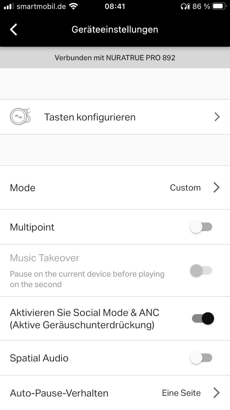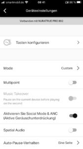 Konzeptionell ist die Schaltung dauerhaft aktiv, solange man nicht in den Transparenzmodus wechselt, was schnell und komfortabel gelingt. Vollständig deaktivieren lässt sich die Schaltung nur in den Voreinstellungen. Echte Vergleiche sind dabei kaum möglich, da mit dem Abschalten auch der Pegel absinkt und die Klangqualität nachlässt. Hörspaß stellt sich also nur bei eingeschaltetem ANC ein. Kurzum: Das Noise Cancelling im NuraTrue Pro stellt durchaus einen Mehrwert im Mobilbetrieb dar, ist aber allein kein hervorstechendes Kaufargument.