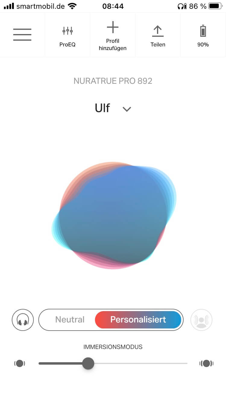 Dass der NuraTrue Pro nicht unbedingt nach höchster Neutralität strebt, ergibt sich bereits aus der subjektiven Einstellung des Immersion-Parameters. Die Basskapazitäten sind beachtlich, wobei ich besagten Regler zumeist bei -1 platzierte, also den Bass sogar etwas absenkte. Wer ein voluminöseres Klangerlebnis wünscht, kann nachregeln. Persönlich empfinde ich Werte abseits des zentralen Trios -1, 0, +1 allerdings nicht mehr als Zugewinn.