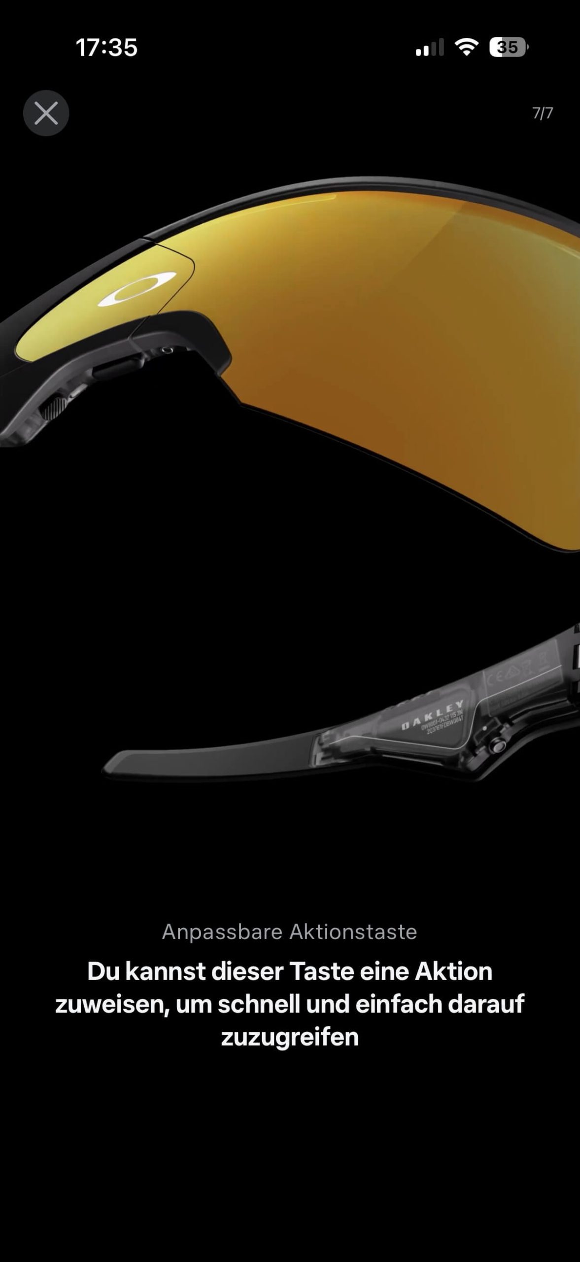 An der Brille gibt es nämlich mehrere, die sich alle im rechten Bügel befinden. Direkt am Oakley-Symbol ist eine Touchoberfläche integriert, auf der man die Wiedergabe durch Tippen starten/pausieren oder die Lautstärke durch Wischen anpassen kann. An der Unterseite sind zwei Tasten. Die vordere breite Taste dient als Auslöser für Fotos (12 Megapixel) und Videos (3K bei 30 FPS), während sich die kleine Taste als nützliche Aktionstaste erweist. Ihr kann man namensgebend eine Aktion zuweisen: etwa den Start von Meta AI.