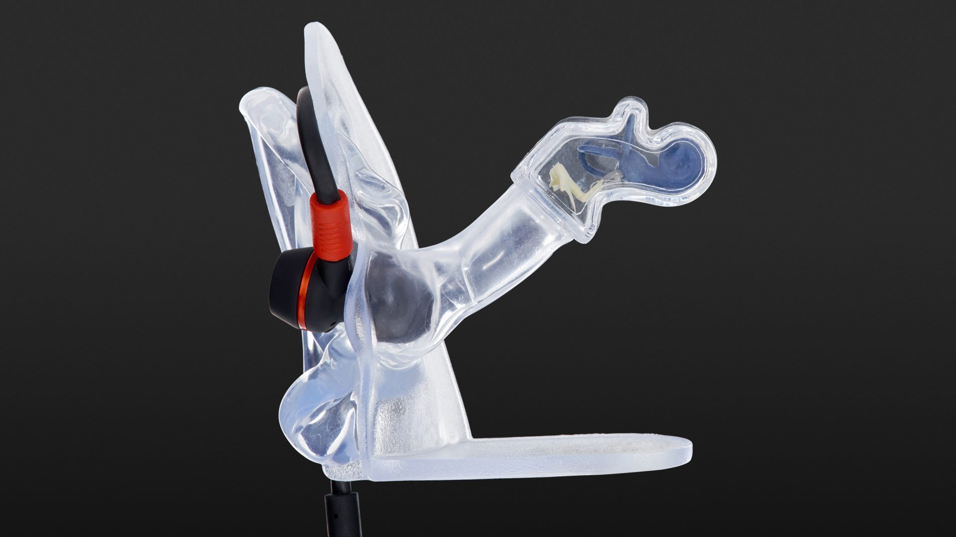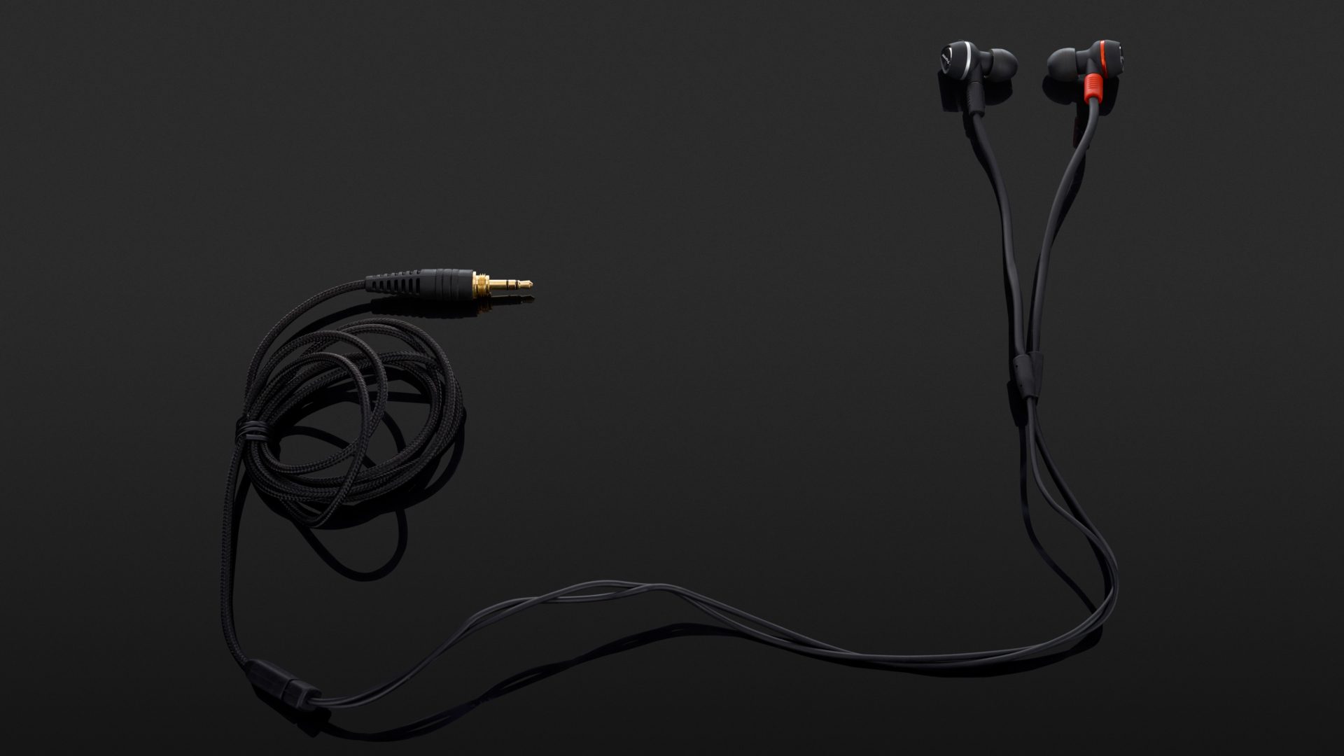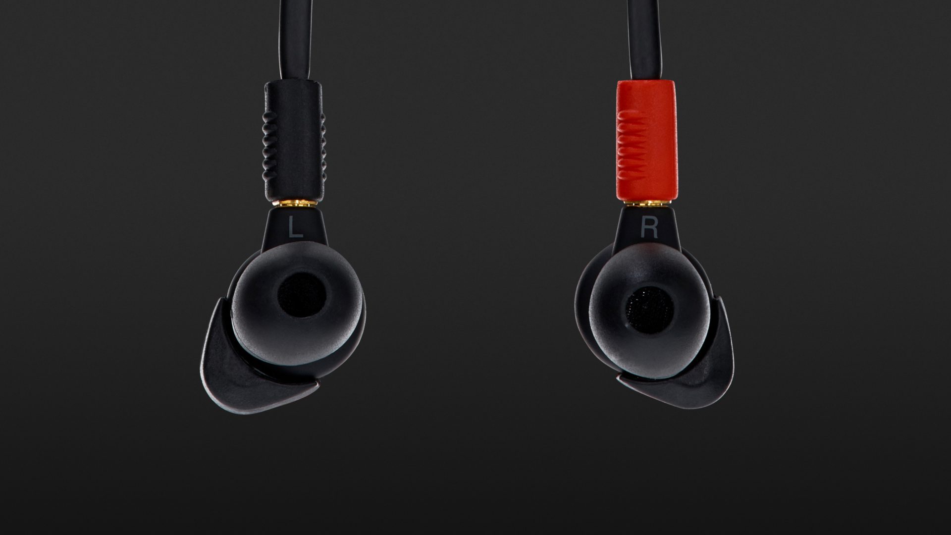 Die ovale Form der Treiberdüsen lässt nur eine Position zu: Das Kabel wird hinter das Ohr gelegt, im Nacken durch eine Schlaufe festgezurrt und über den Rücken geführt. Dies verhindert ein Herausreißen der Ohrhörer durch ungewolltes Hängenbleiben am Kabel.