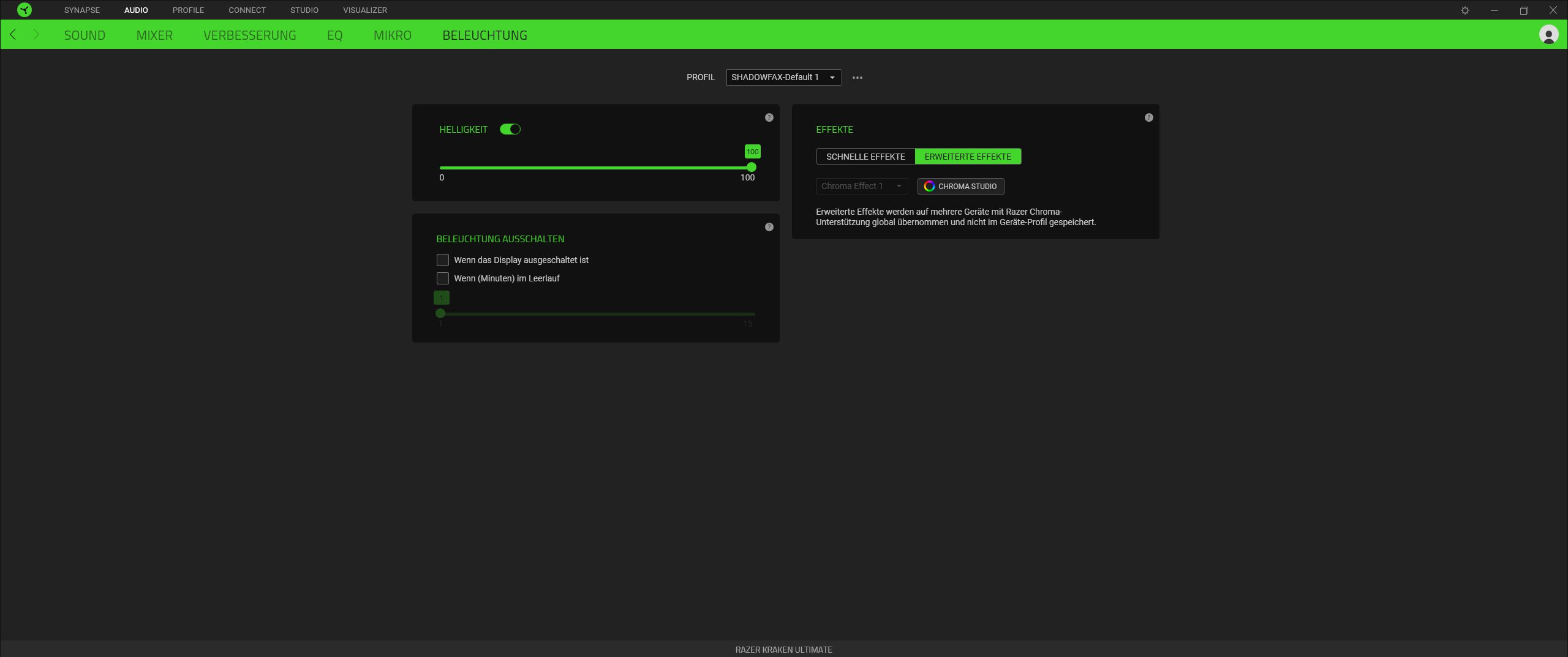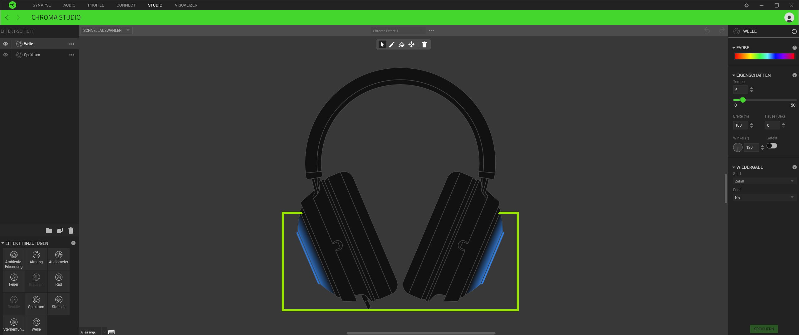 Zum Anschließen bietet das Kraken Ultimate ein fest verbautes USB-Kabel von zwei Metern Länge. Mit dem Computer verbunden, öffnet sich sogleich ein Installationsfenster der Synapse Software, falls diese nicht bereits auf dem Rechner ist. Über diese Software wird im Prinzip alles gesteuert und hier finden wir auch das Chroma Studio: Dort lässt sich die Farbe des Logos an beiden Ohrmuscheln in vielen Varianten ändern. 16,8 Millionen Farben stehen zur Auswahl. Dazu kommen nette Effekte, mit denen Farbwechsel konfiguriert werden können, egal ob in einem bestimmten Rhythmus oder durch eingehende Audiosignale. Diese Effekte lassen sich auch schichten und so kann man ein ganz individuelles Farbdesign anlegen. Wer jetzt noch weitere Chroma-Geräte von Razer sein Eigen nennt, kann sich hier eine recht beeindruckende Lichtshow zusammenstellen.