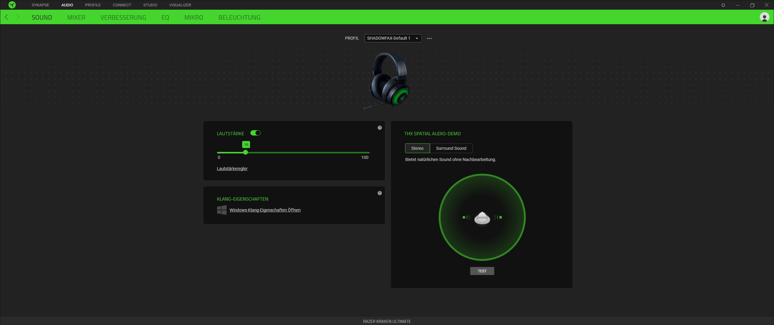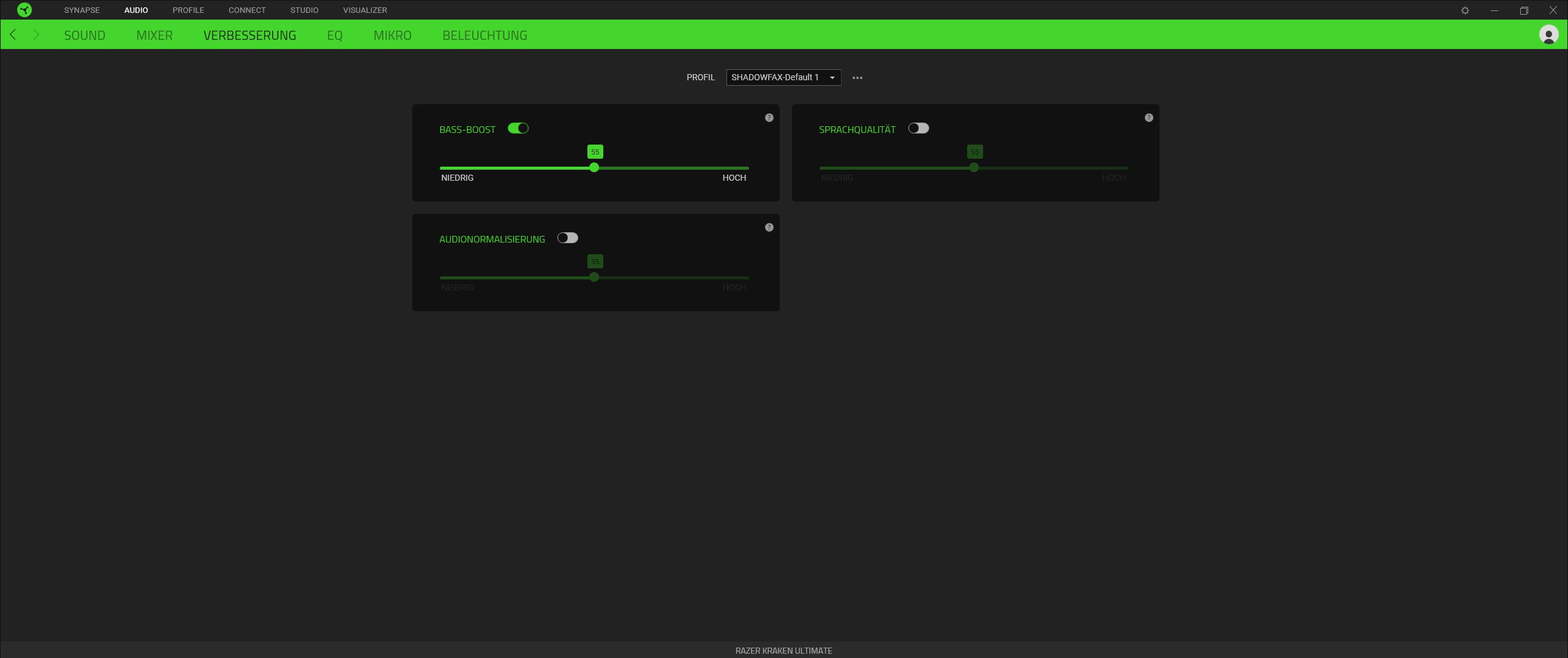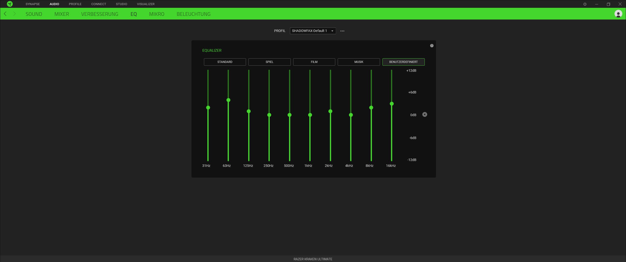 Mit dem Standard-EQ-Profil klingt das Kraken Ultimate okay, aber leider auch nicht mehr. Weder kommen dicke Bässe durch, noch klare Höhen. Dies mag für diejenigen ein Problem darstellen, die das Headset nicht am PC mit der Software benutzen, sondern an einem anderen Endgerät, wie beispielsweise an einer Konsole. Besser wird es, wenn man sich in der Synapse Software durch die EQ-Presets klickt. Hier finden wir voreingestellte Klanganpassungen für Spiel, Film und Musik. Ein Wechsel von „Standard“ auf „Musik“, während man selbige hört, ist nicht nur akustisch wahrnehmbar, sondern auch optisch: Tiefe Frequenzen werden angehoben und die Höhen öffnen sich.
