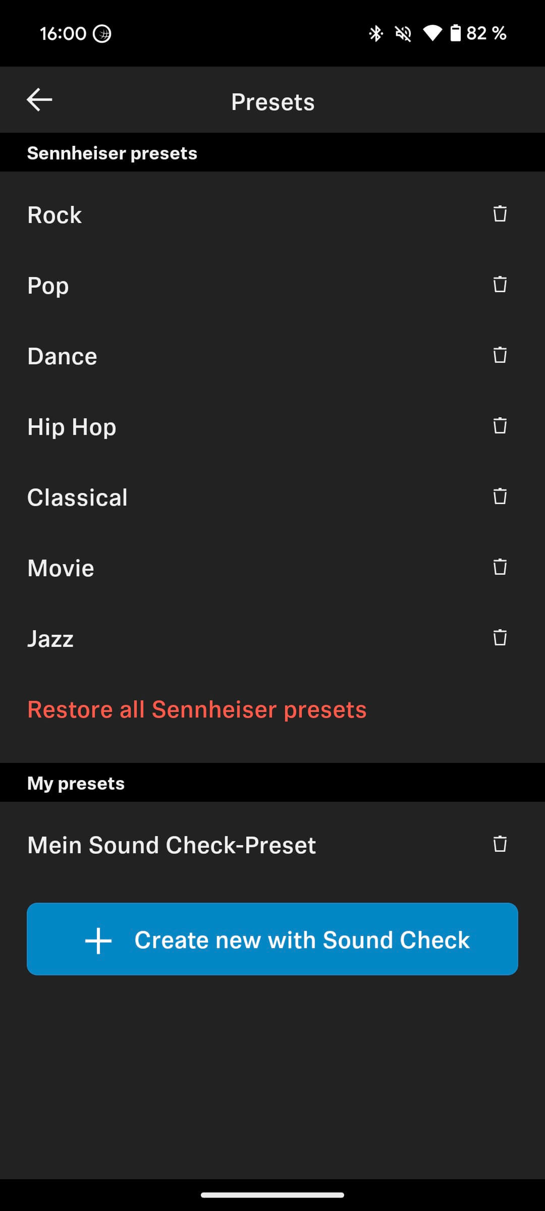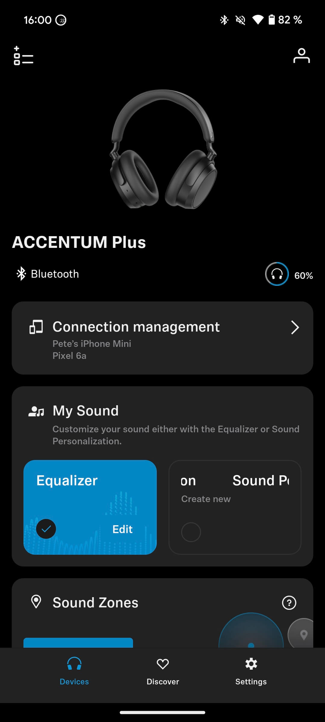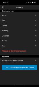Ein fünfbandiger EQ lässt euch den Sound tunen, oder ihr wählt zwischen sieben Musikgenre-Presets eine passende EQ-Kurve aus. Diese lassen sich editieren und abspeichern. Zusätzlich bietet die App auch eine individuelle Frequenzanpassung, indem ihr euch, während eure Lieblingsmusik spielt, durch mehrere Klangprofile klickt. Diese gehörangepasste EQ-Kurve könnt ihr abspeichern und beliebig oft wiederholen. Das erfordert einen kostenlosen Account bei Sennheiser, um die eigenen EQ-Einstellungen sowie Soundzonen (siehe unten) geräteübergreifend nutzen zu können.