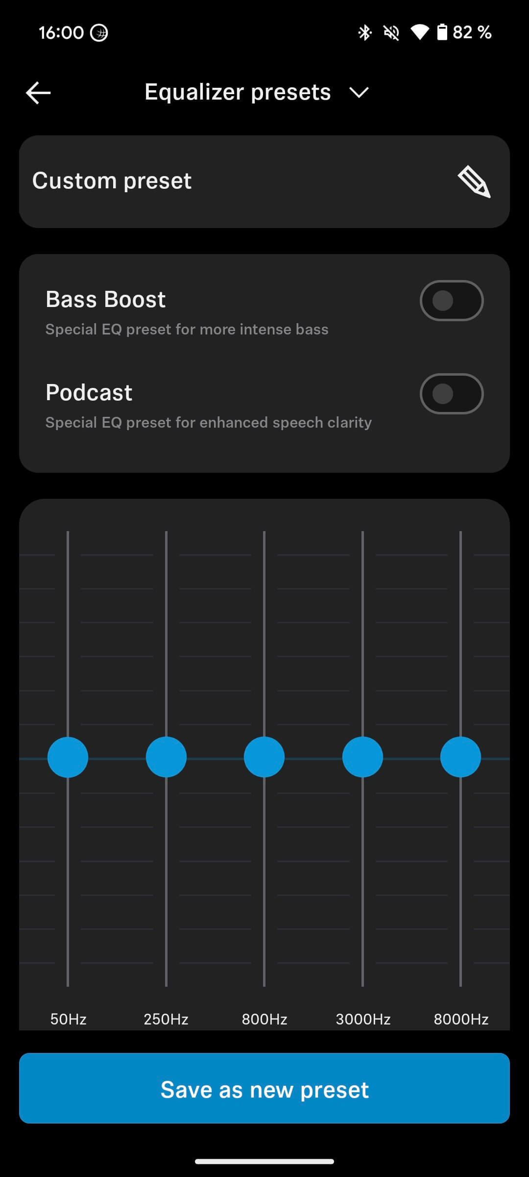 Hier finden wir dann noch ein spezielles EQ-Preset für intensivere Bässe sowie eins für Podcasts, das für eine bessere Sprachverständlichkeit sorgt, indem v.a. der Mittenbereich herausgearbeitet wird.