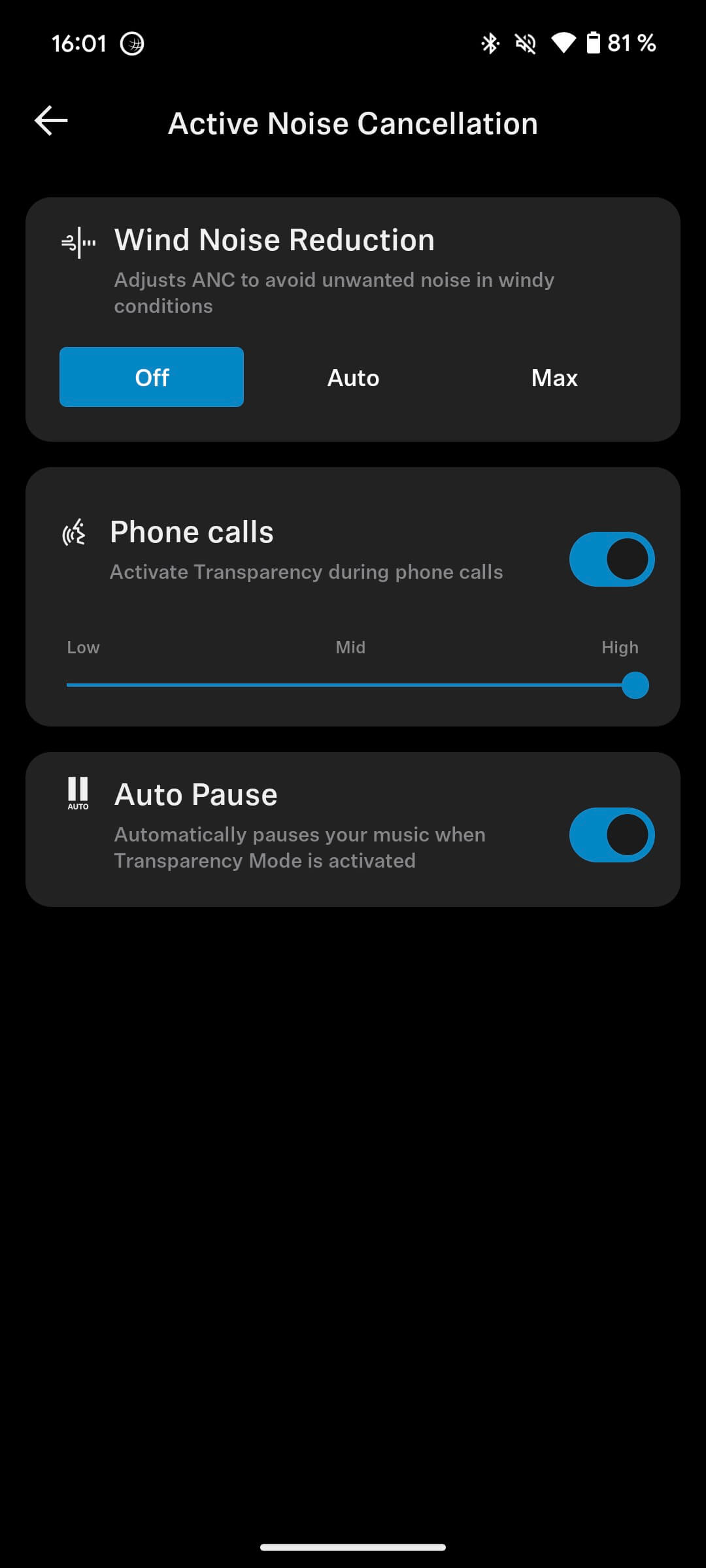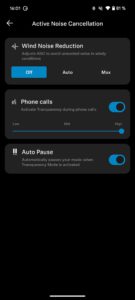 Mit dem Regler „ANC zu Transparenz“ könnt ihr ein Mischverhältnis erreichen, allerdings funktioniert das nur, wenn die Windgeräuschunterdrückung ausgeschaltet ist.