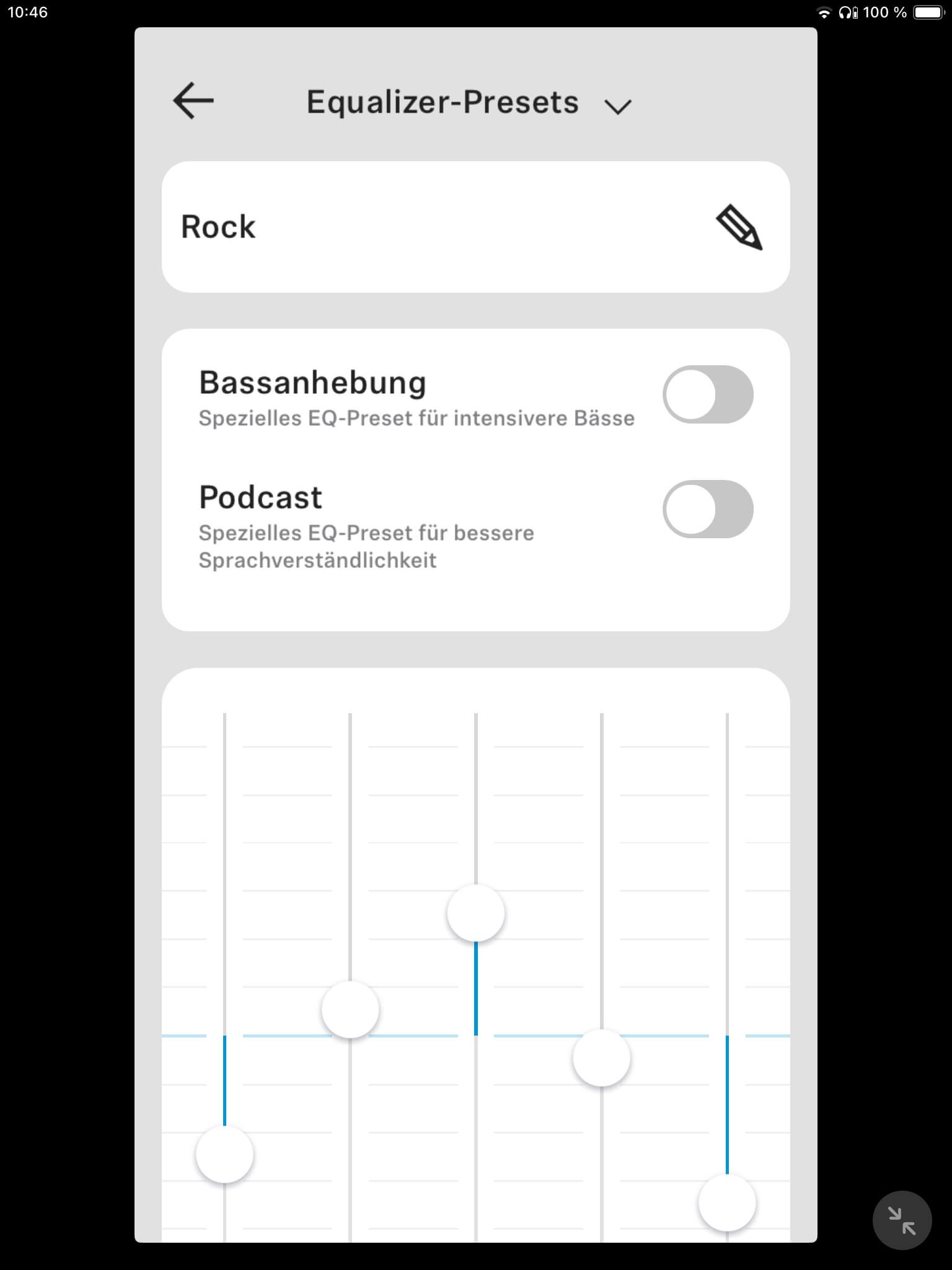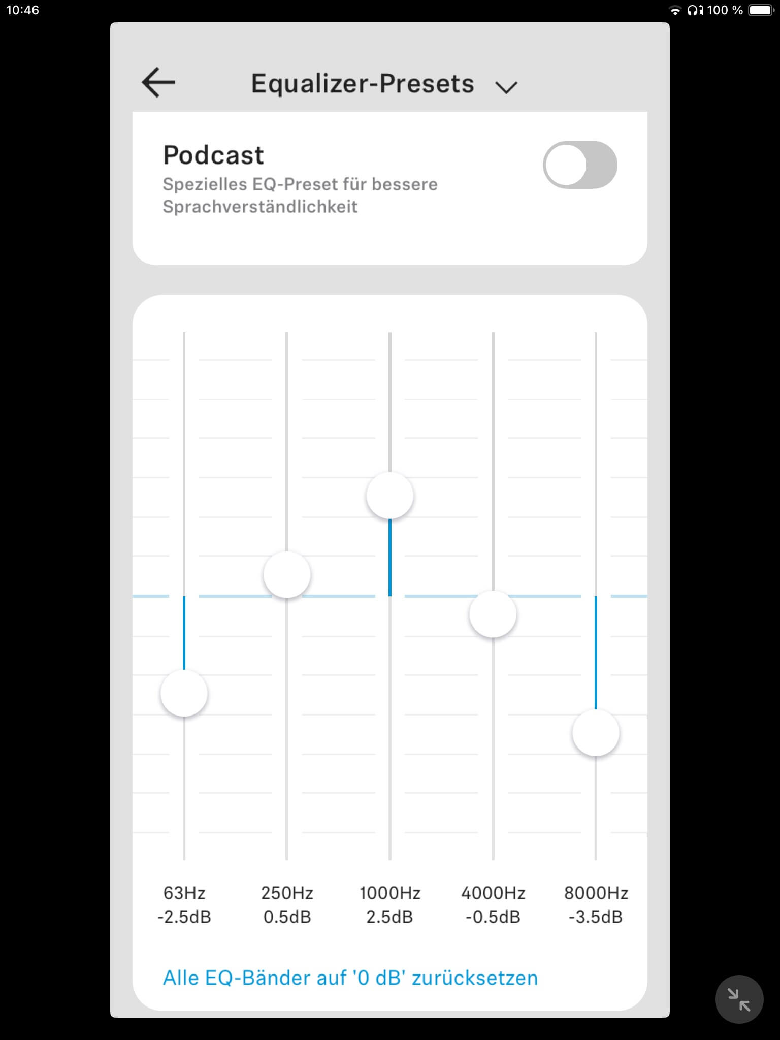 Die Klangregelung der App-Anbindung (Android und iOS) umfasst zwei direkt zuschaltbare Modi zur Bassanhebung oder einer verbesserten Sprachverständlichkeit namens „Podcast“. Darüber hinaus stehen über die EQ-Sektion mit „Rock“, „Pop“, „Dance“, „Hip Hop“, „Klassik“, „Film“ und „Jazz“ sieben Presets zur Verfügung, die als Ausgangsbasis für eigene Einstellungen dienen können und eine gute Orientierung bieten.