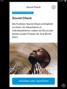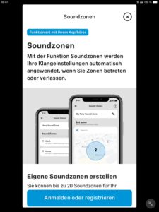 Als weiteres Hilfsmittel kann die Sound-Check-Funktion eingesetzt werden, um eigene Presets zu erstellen, was jedoch eine Registrierung voraussetzt. Ein Sennheiser-Konto wird auch für die Einrichtung sogenannter Soundzonen benötigt, über die sich automatisch an bestimmten Orten (Zuhause, Fitnessstudio etc.) vorkonfigurierte Klangeinstellungen nutzen lassen.