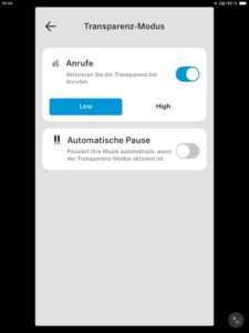 Ein dreistufiger Transparenzmodus ermöglicht eine Anpassung an unterschiedliche Umgebungen. Zudem kann eingestellt werden, ob die Wiedergabe beim Einschalten pausieren soll. Als weitere Option lassen sich Außengeräusche in zwei Intensitätsstufen bei Telefonaten verstärken, wodurch die eigene Stimme auf eine natürlichere Weise mithörbar ist.