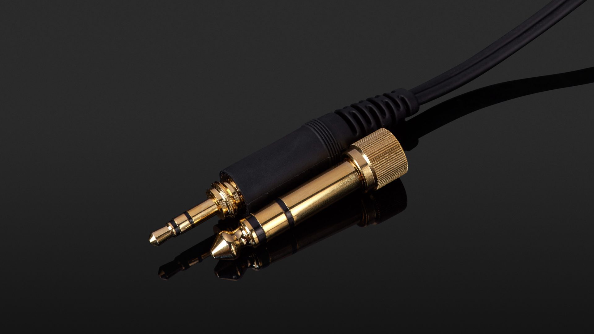 An den beiden Unterseiten der Kapseln befinden sich die Steckverbindungen für das somit zweiseitig geführte und austauschbare drei Meter lange, gerade Kabel. Der Anschluss mit 3,5 Millimeter Klinkenstecker plus vergoldeten 6,3 Millimeter Klinkenadapter ist nicht gewinkelt, wie man es von den anderen Modellen kennt.