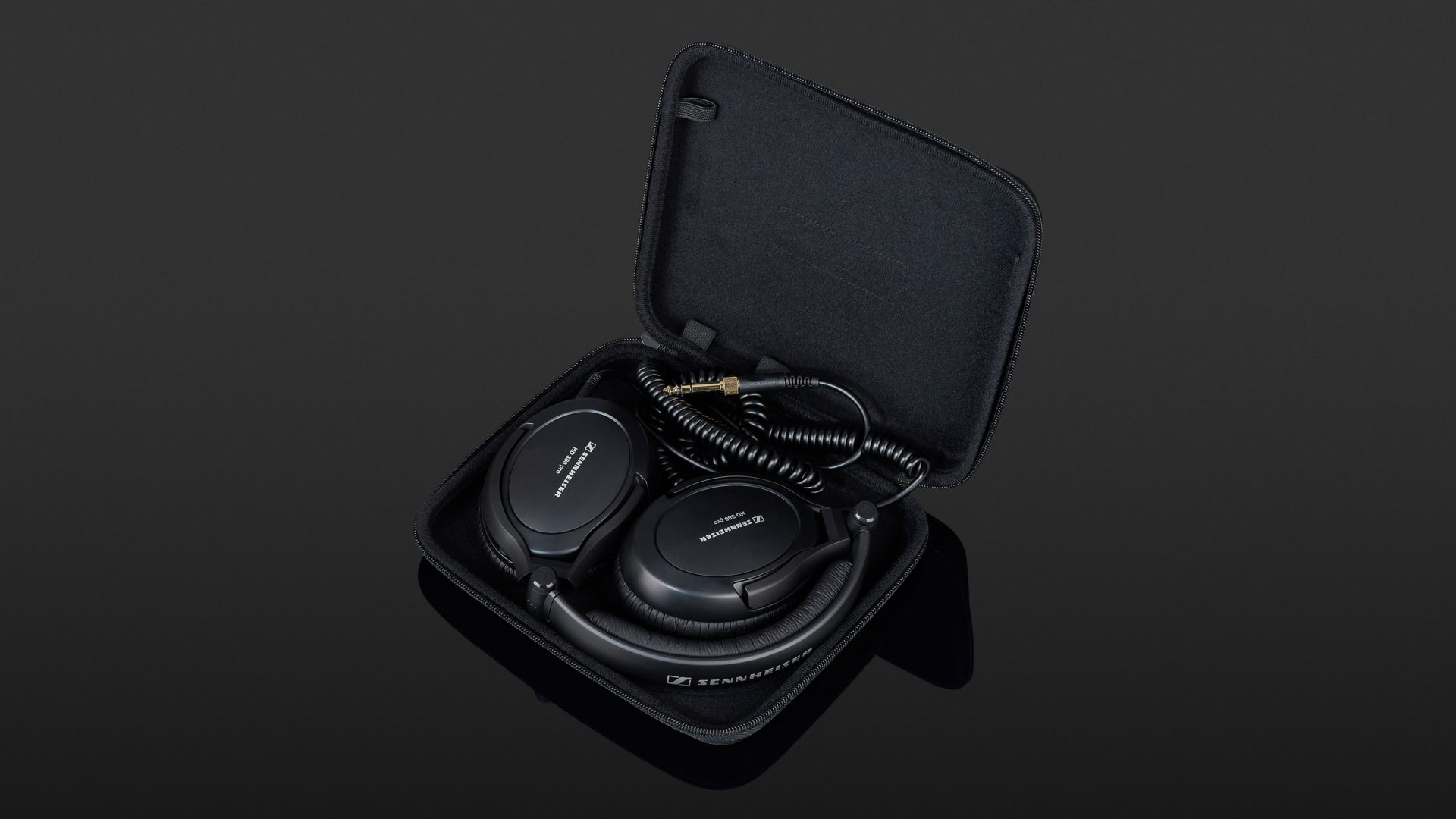 Optisch gibt sich der HD 380 Pro seriös: Bis auf die Beschriftung an der Rückseite der Hörmuscheln ist alles an ihm in Schwarz gehalten. Die Hörmuscheln selbst sind in der Hochachse drehbar und lassen sich an Gelenken einklappen, so dass der Sennheiser sehr elegant in dem mitgelieferten flachen Case zu liegen kommt. Das Spiralanschlusskabel ist im Bereich von einem bis drei Metern dehnbar, findet seinen Abschluss in einer Miniklinke, und ein Adapter liegt dem Kopfhörer bei. Das Anschlusskabel ist erfreulicherweise wechselbar – ein Feature was ich in dieser Preisklasse und der Fokussierung auf einen Studiobetrieb gerne sehe, ein entsprechendes Ersatzkabel kann u.a. auf der Herstellerseite erworben werden.