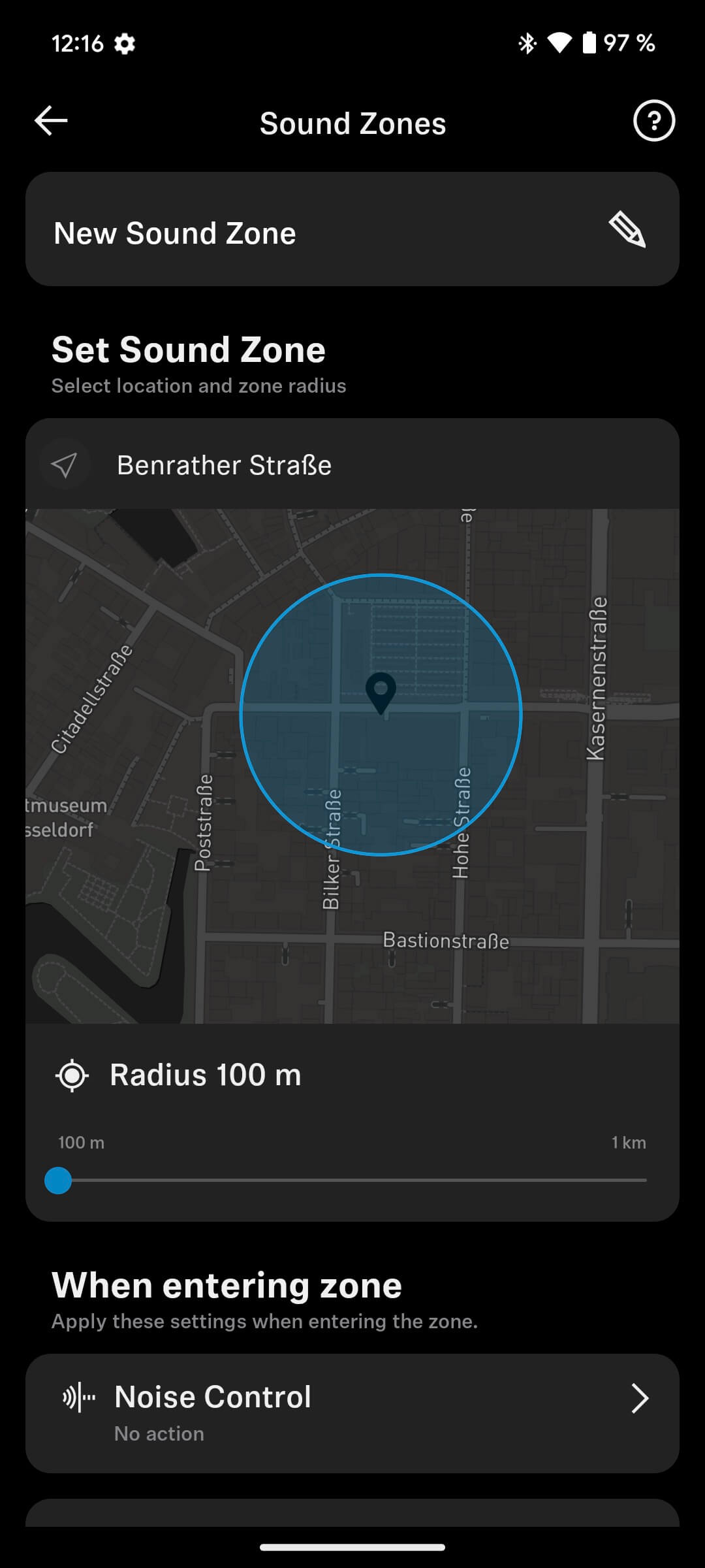 Mit Soundzonen definiert ihr, wie sich die Kopfhörer verhalten, wenn ihr definierte Orte betretet oder verlasst. Wenn das Noise Cancelling samt individueller EQ-Einstellung aktiviert werden soll, sobald ihr das Haus verlasst, könnt ihr dies entsprechend konfigurieren.
