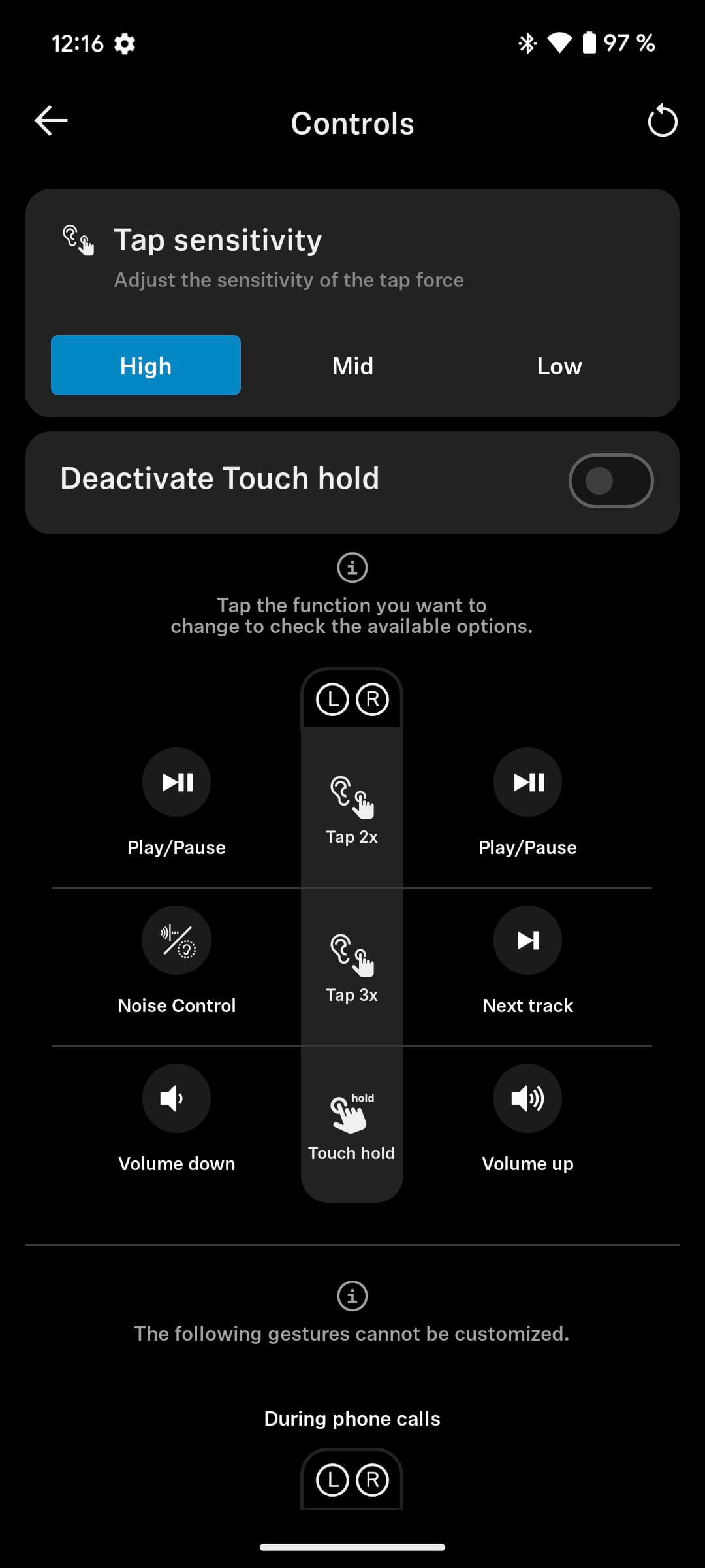 Die Steuerung der In-Ears, die auch eine einseitige Nutzung im Single-Betrieb unterstützen, erfolgt über die zwei Funktionen „Touch Control“ und „Tap Control“. „Touch Control“ bedeutet die klassische Bedienung per Fingertipp auf die Hörer. Dank Sensoren unterstützen sie mit „Tap Control“ aber auch das Steuern per Fingergesten in die Nähe des jeweiligen Ohrhörers, sprich vor der Ohrmuschel oder auf einer aufliegenden Mütze. Das bedarf allerdings Übung, nicht immer erkennen die Hörer die Befehle, sodass ein Dreifach-Tap dann gerne mal als Doppel-Tap interpretiert wird, was dann, anstatt das ANC zu schalten, die Medienwiedergabe pausiert. Ein Firmware-Update (V 3.18.15) brachte uns hier aber eine merkliche Verbesserung, dennoch arbeitet diese Art der Steuerung noch nicht zu 100 Prozent zuverlässig. In der hauseigenen App lässt sich zwar die Empfindlichkeit einstellen, was auch eine Verbesserung bringt, allerdings reagieren dann die In-Ears recht empfindlich auf Berührungen.