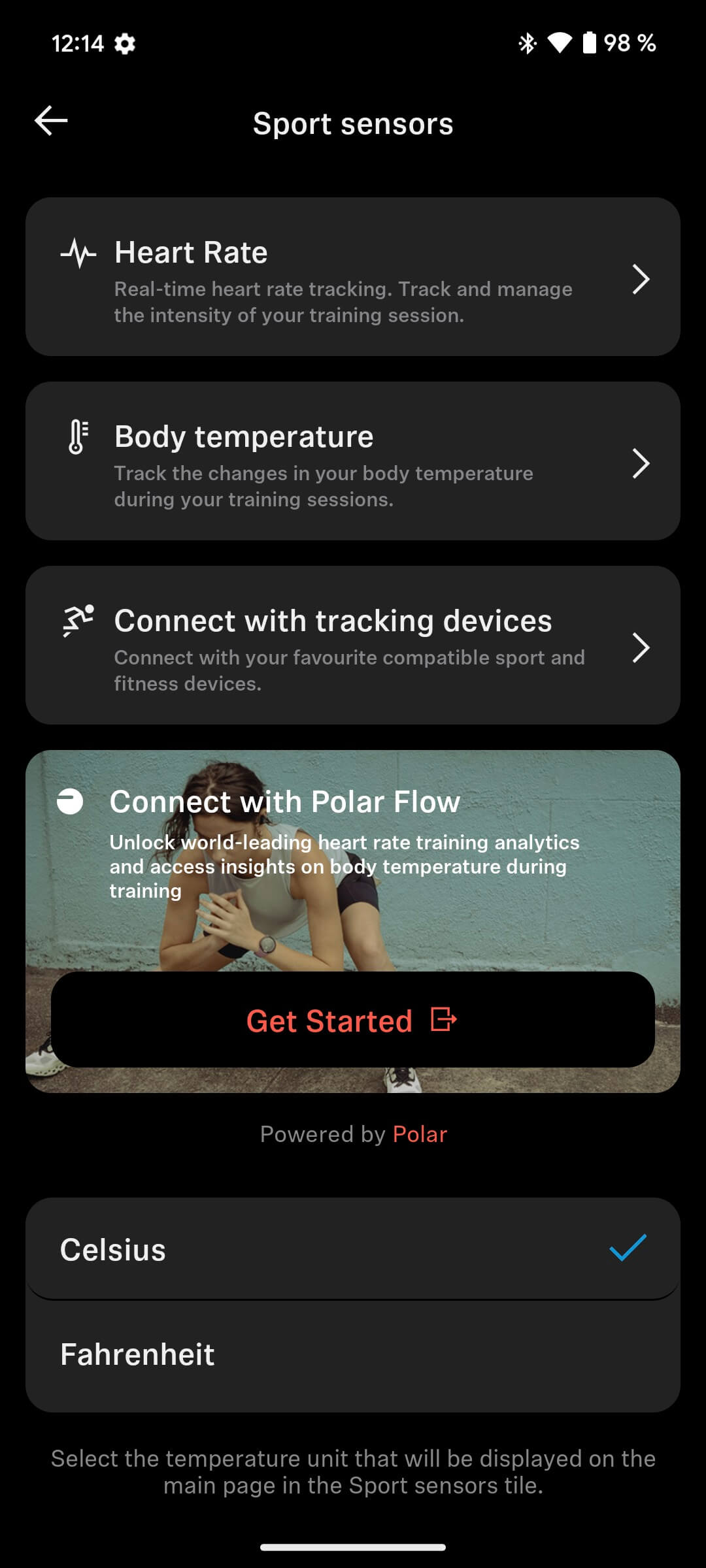 Die Verknüpfung mit der Polar Flow App gelingt dabei spielend und nach wenigen Sekunden erscheinen in der oberen Leiste die Echtzeitdaten der Körpertemperatur und der Herzfrequenz. Wer dann den Fitness Test absolvieren will, wird allerdings enttäuscht, denn dieser lässt sich trotz Verknüpfung mit HF-Sensor nicht starten. Klickt man dann auf den Link, der zu einer Liste unterstützter Sensoren führen soll, erfährt man darüber leider wenig bis nichts.