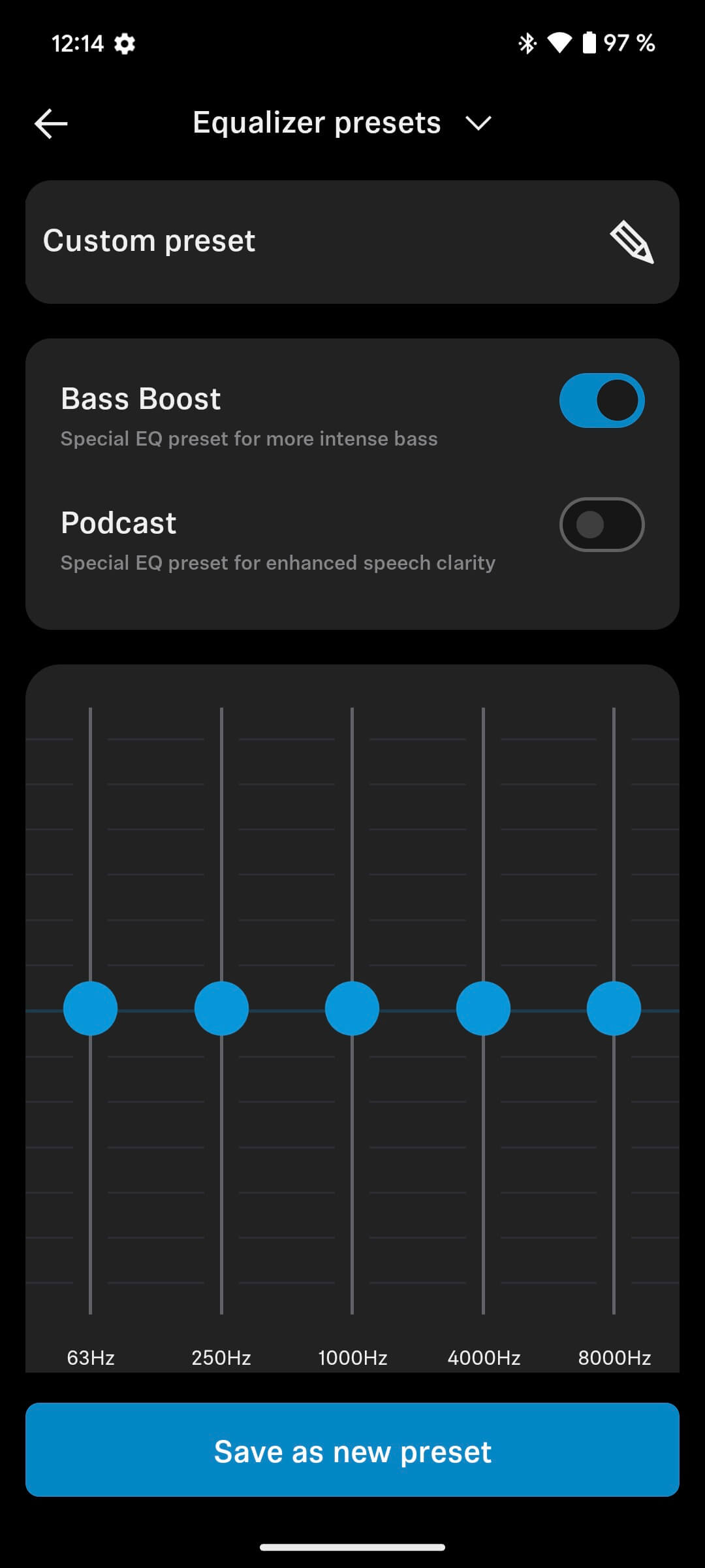 Zusätzlich finden wir in der App ein spezielles EQ-Preset für intensivere Bässe sowie eines für Podcasts, das für eine bessere Sprachverständlichkeit sorgt, in dem der Mittenbereich angehoben wird.