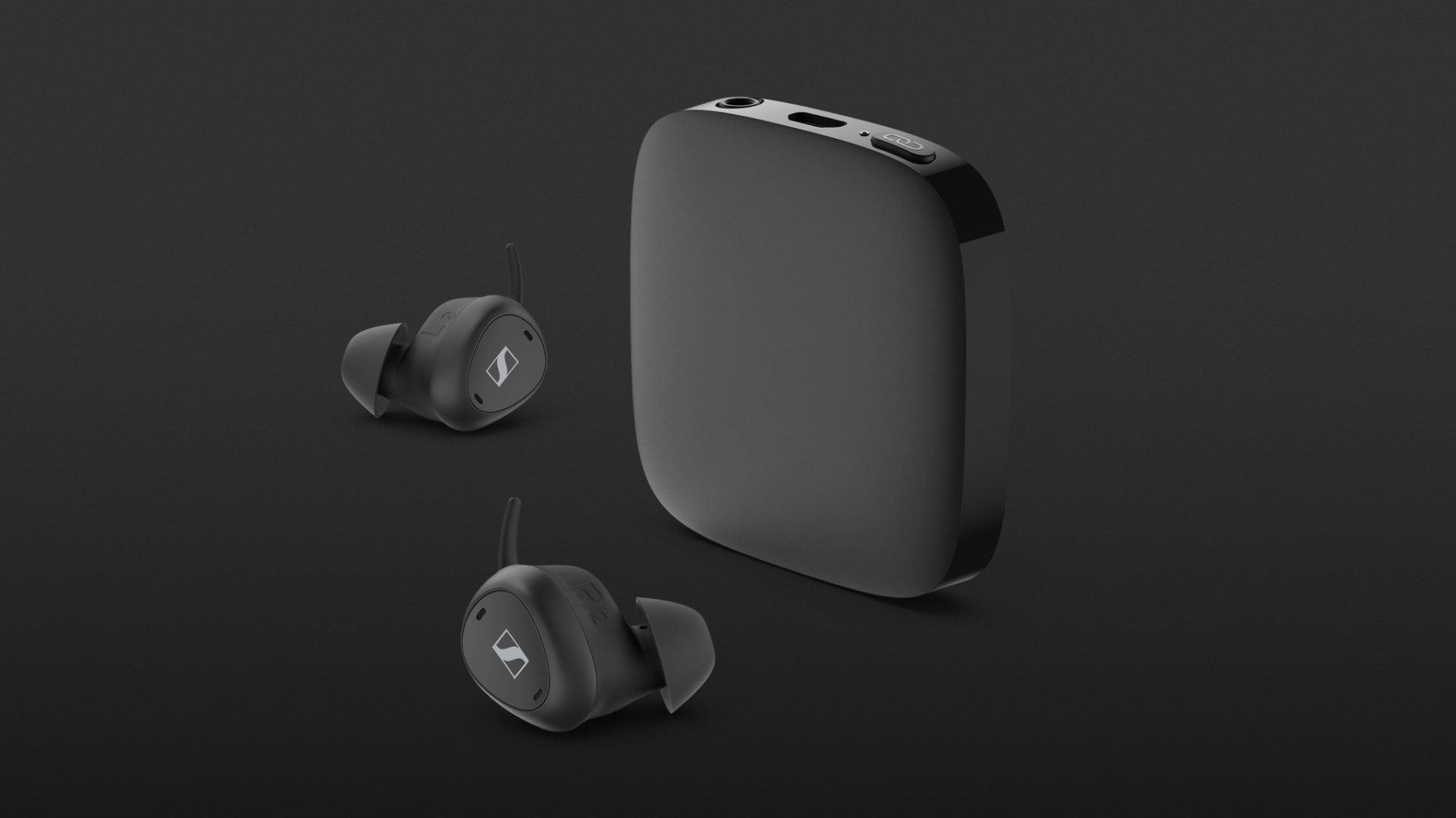 Das Sennheiser TV Clear Set besteht, wie der Name vermuten lässt, aus mehreren „Teilen“: den True-Wireless-Kopfhörern samt Lade-Case und einer kleinen schwarzen Box, dem Transmitter. Zusätzlich liegen noch drei Paar Silikon-Adapter, ein Miniklinken-, ein Toslink- sowie ein USB-Ladekabel in der Verpackung.