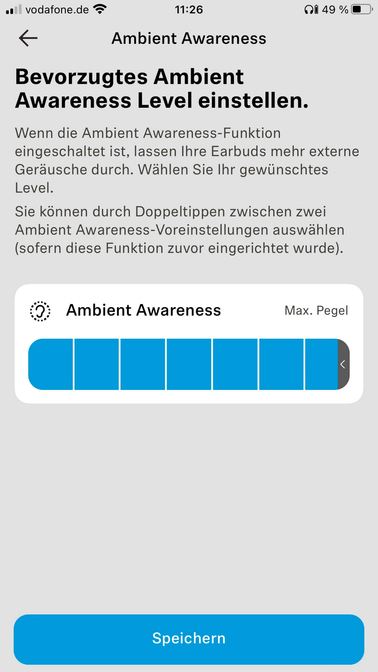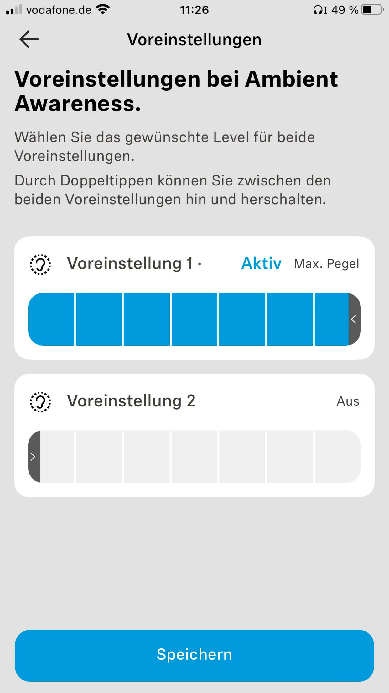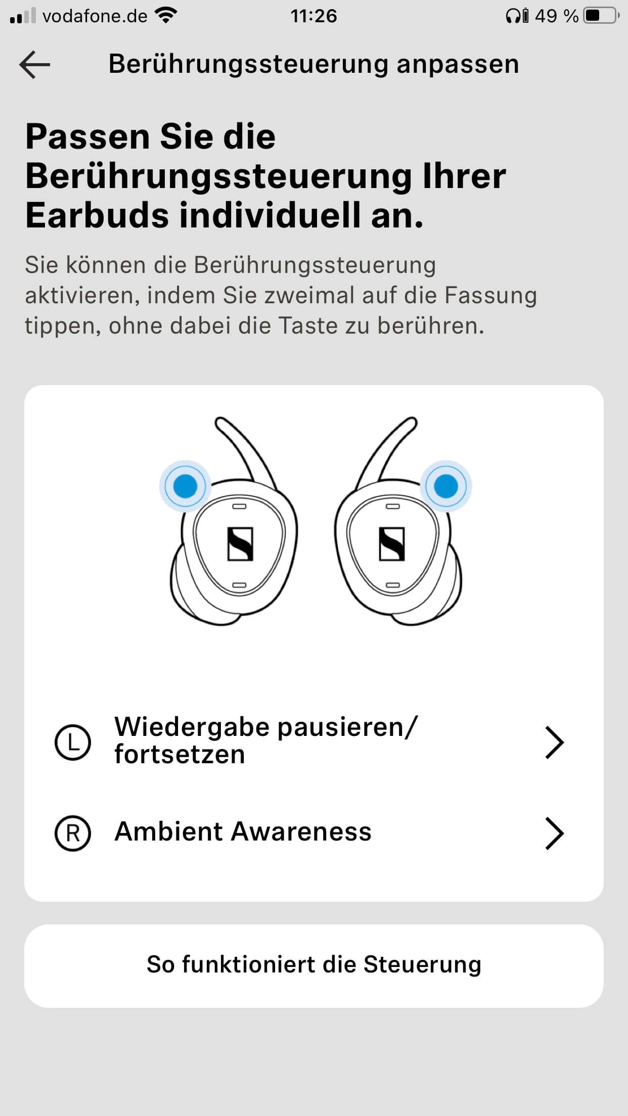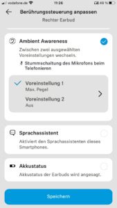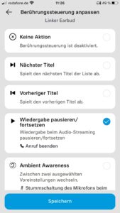 Die Ohrstöpsel lassen sich über Drucktaster und Touch-Flächen bedienen. Dabei übernehmen die Taster nicht nur die Lautstärkekontrolle, auch die Änderung der fünf verschiedenen Sprachverständlichkeitsprogramme sowie die Anrufverwaltung lassen sich damit steuern. Die berührungsempfindlichen Oberflächen kümmern sich um die Wiedergabe (Play, Pause) und um den Transparenzmodus. Während die Taster über einen angenehmen Druckpunkt verfügen und Eingaben zuverlässig ausführen, reagieren die Touch-Felder bei unserem Testmodell leider nicht so, wie erhofft: Nicht immer wurde der Transparenzmodus per Doppel-Tap de- bzw. aktiviert. Zudem kann das recht laute Rascheln, dass die Mikrofone des aktivierten Umgebungsmodus durch (versehentliches) Fingerwischen/-klopfen einfangen, als sehr unangenehm empfunden werden.