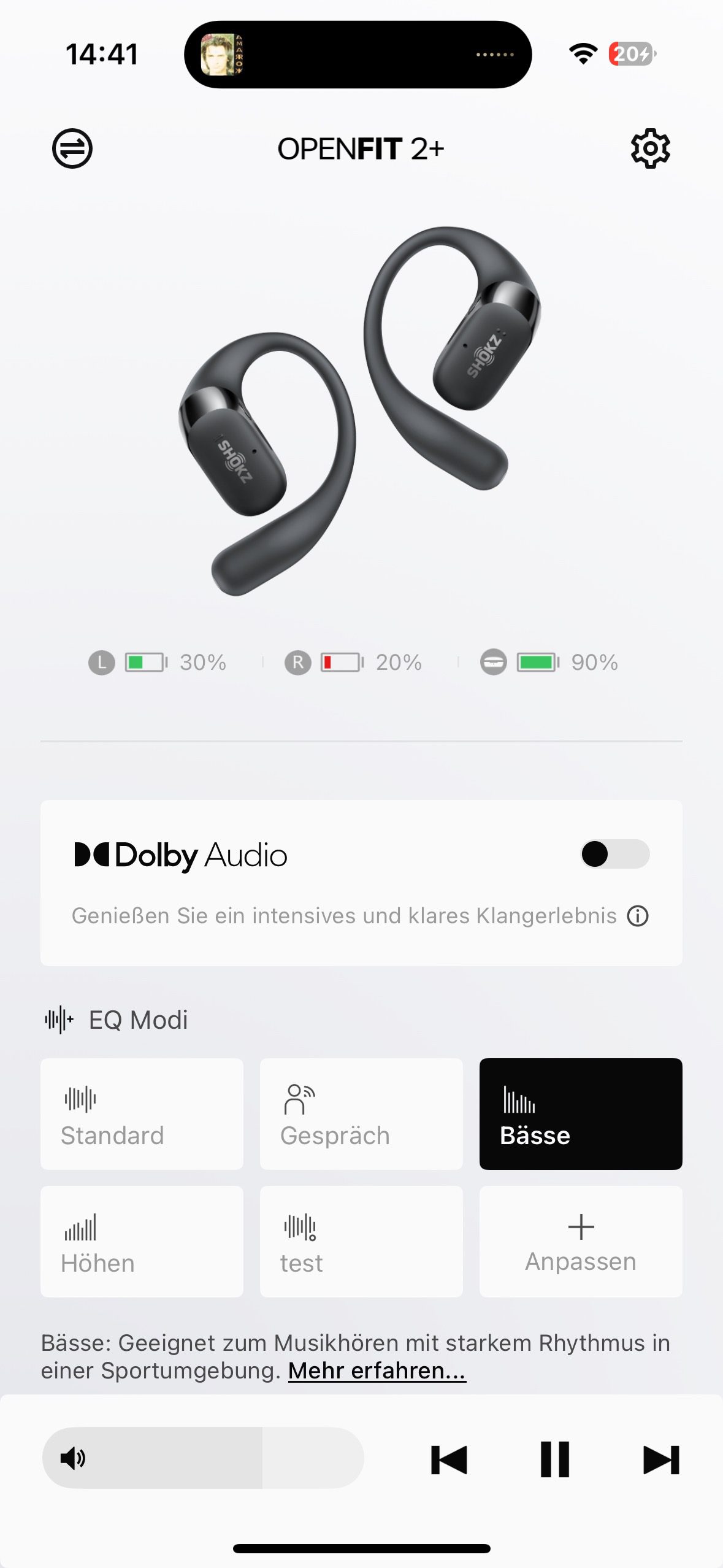Shokz ist hier gelungen, was bei bisherigen Open-Ears in der Form noch nicht vorkommt: Ein direkter, punchy Bass spielt intensiv und druckvoll auf und bildet dabei ein festes und sicheres Fundament für Mitten und Höhen, deren Verhältnis manchmal etwas unausgeglichen wirkt – gerade im Dolby-Atmos-Betrieb. Da werden die Mitten manchmal eine Spur zu überbordend. Ist das mit dem EQ etwas auskuriert, gelingt den OpenFit 2+ ein mehr als solider, transparenter und sehr dynamischer Auftritt.