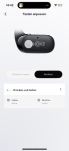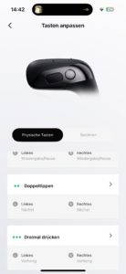 Gefunkt wird über Bluetooth 5.4 und die Audio-Codecs SBC und AAC werden unterstützt. Multipoint-Verbindungen sind möglich, also die gleichzeitige Verkopplung zweier Devices – Phone und Laptop zum Beispiel. Zur Steuerung bieten die OpenFit 2+ primär einen physischen Taster auf jeder Seite, der leicht erhaben, schnell und zielsicher – beim Laufen oder Radfahren – gefunden und ausgelöst werden kann. Play/Stop/Skip, Lautstärke und Anrufe werden so remote bedient. Darüber hinaus kann in der App ein Touchfeld aktiviert werden, wo sich über Drücken und Halten die digitale Assistenz aufrufen lässt.