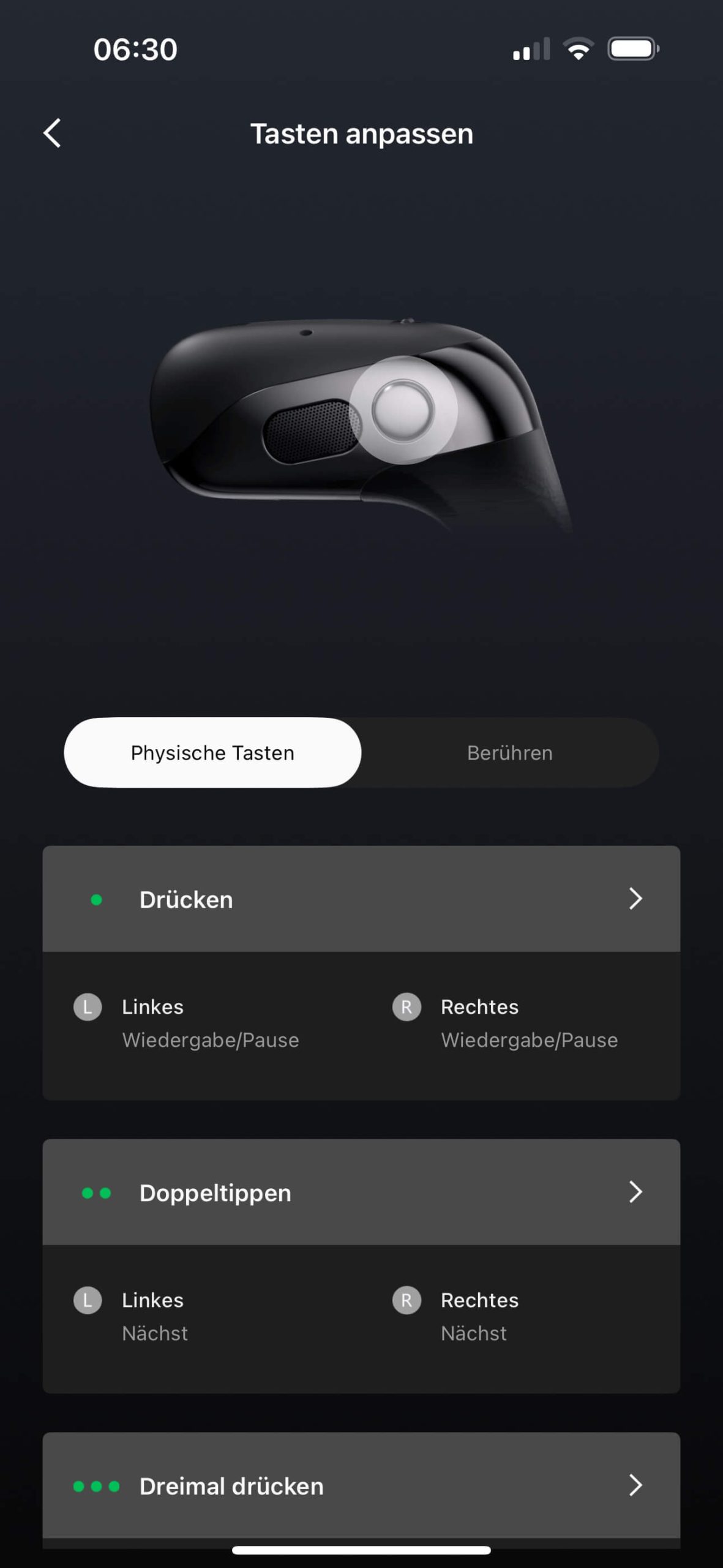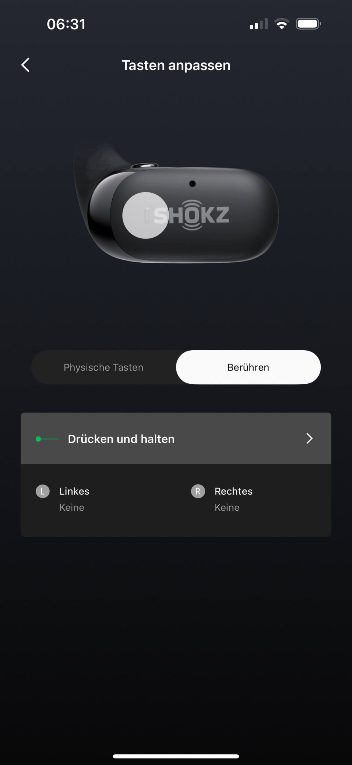 Die Bedienung des Shokz OpenFit 2 ist geradlinig. Über die kostenlose, mehrsprachige Shokz-App für iOS und Android lassen sich die mechanischen Tasten sich für Einfach- bis Dreifachklicks sowie längeres Halten konfigurieren. Allerdings sind die verfügbaren Funktionen für die Musikwiedergabe, Titelsprünge und Lautstärkeveränderungen nicht frei zuweisbar, sondern lediglich einzeln aktivierbar und dazu für die linke und rechte Hörerseite stets identisch. Hier sehe ich Potenzial zur Verbesserung. Die Touch-Funktion ist ab Werk zunächst deaktiviert, lässt sich aber für den Anruf des Sprachassistenten nutzen.