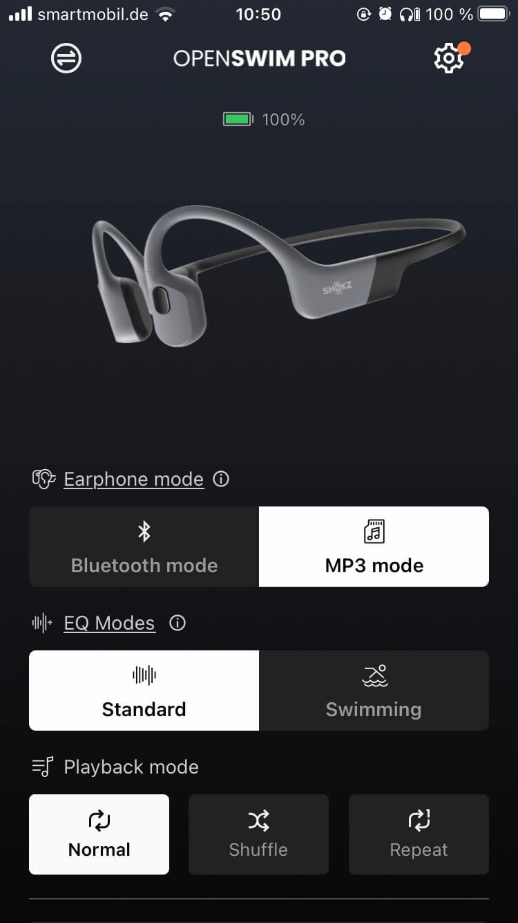 Da Bluetooth unter Wasser keine Option ist, bietet der Shokz OpenSwim Pro zwei Betriebsarten: den regulären und den Schwimm-Modus, bei dem die Musikwiedergabe aus besagtem integriertem Speicher erfolgt, der sich über USB mit beliebigen Audiodateien »betanken« lässt. Shokz legt hierzu ein spezielles USB-Kabel bei, das natürlich auch dem Ladevorgang dient. Der Bluetooth-Modus gestattet zusätzlich ein Umschalten zwischen neutralem Frequenzgang und einem Modus mit Mittenbetonung für Stimmen. Besagte EQ-Umschaltung, ein mögliches Multi-Pairing aber auch Firmware-Updates lassen sich über die kostenlose Shokz-App für iOS und Android vornehmen.