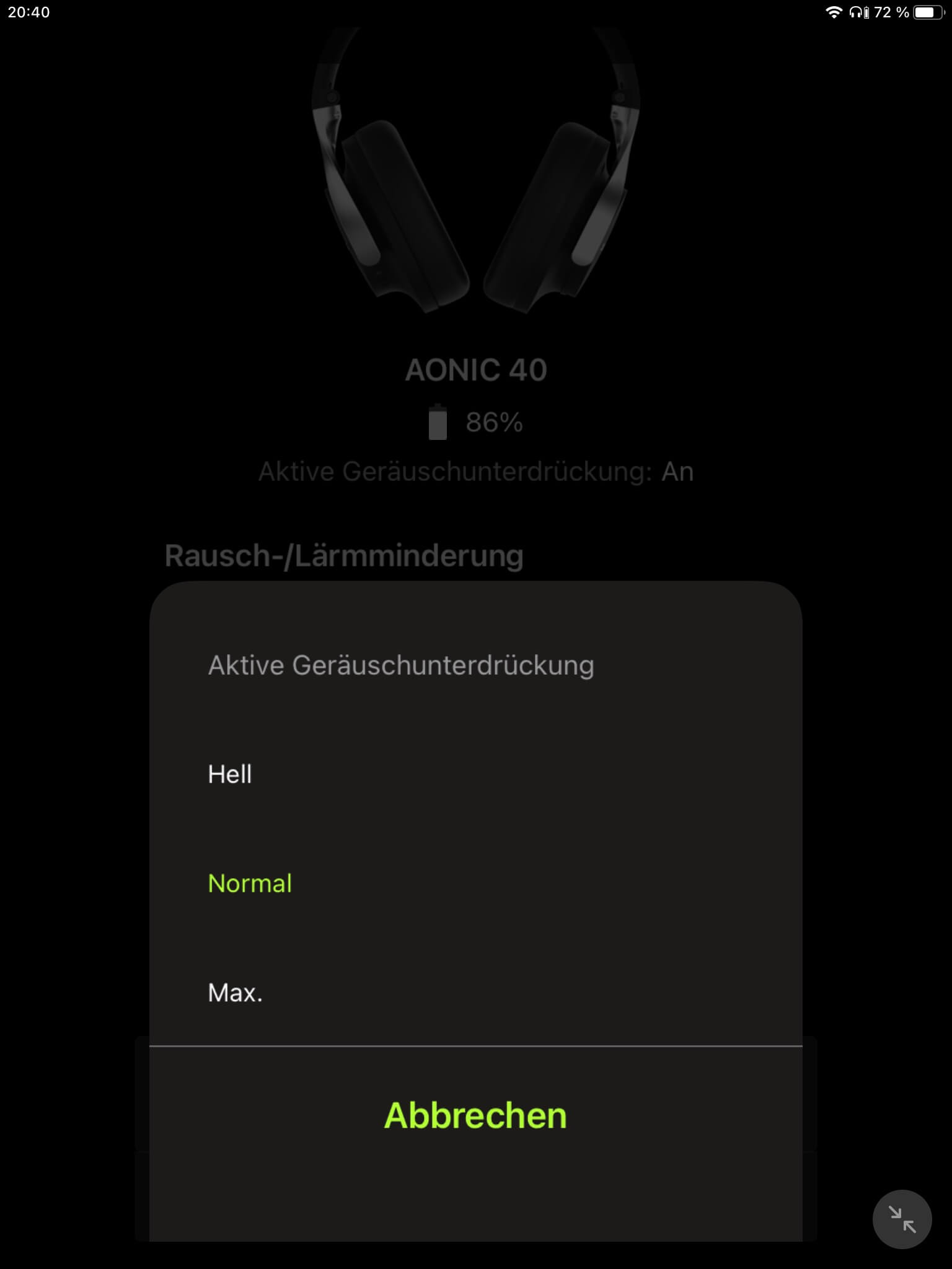 Zu den weiteren App-Funktionen zählen Firmware-Aktualisierungen und hörerbezogenen Einstellungen wie ein Timer, Vorgaben zum Ladeverhalten im USB-Audiomodus oder die Option für einzelne Ereignisse ein akustisches Feedback zu definieren. Hierbei können multilinguale Sprachansagen oder Töne inklusive der gewünschten Lautstärke ausgewählt werden. Zudem sind das Noise Cancelling und der Umgebungsmodus der Shure Aonic 40 konfigurierbar. Während die Geräuschunterdrückung durch die drei Modi „Hell“, „Normal“ und „Maximal“ an verschiedene Umgebungen angepasst werden kann, ist die Intensität der Verstärkung von Außengeräuschen im Umgebungsmodus anhand von zehn Stufen justierbar.