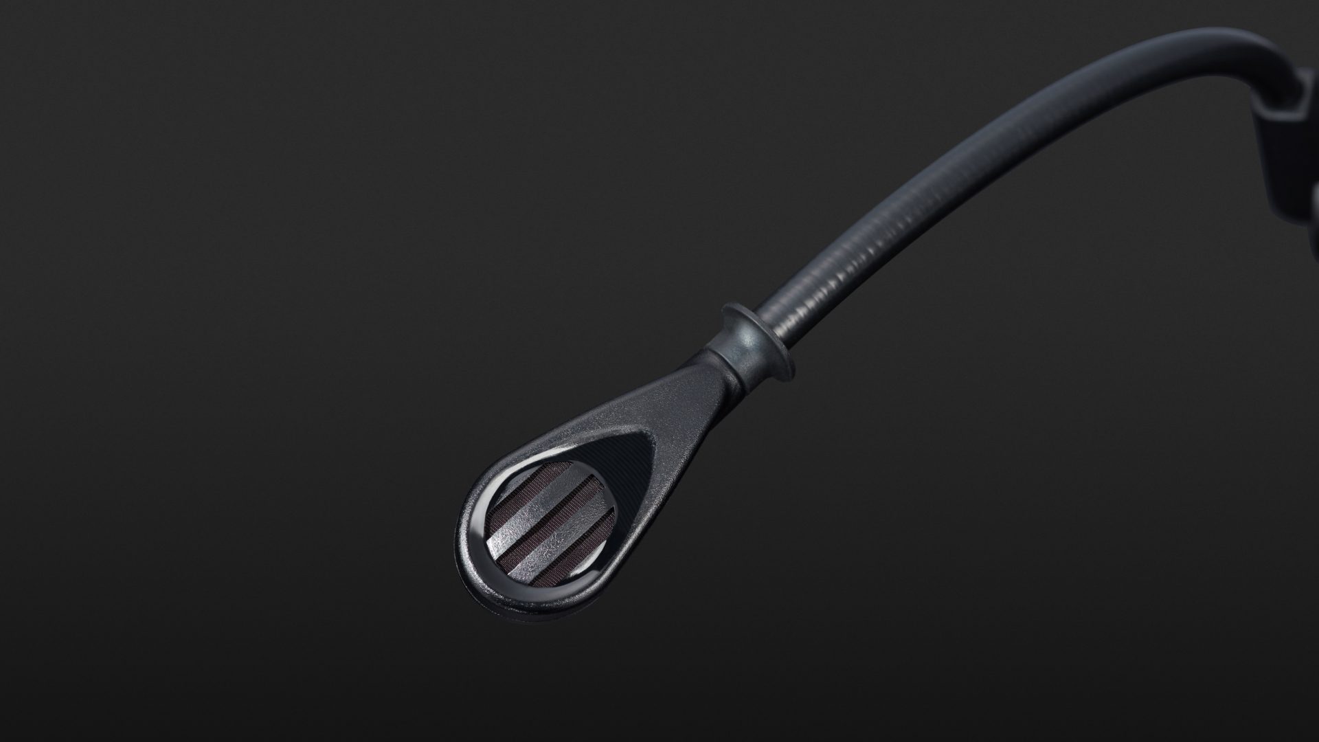Der zu beiden Seiten herunterklappbare Mikrofonarm ermöglicht den Einsatz des Headset-Mikrofons auf beiden Seiten. Klappt man den Arm nach oben, wird das Mikrofon automatisch stummgeschaltet – in der Praxis eine sehr gute Option. Der Mikrofonarm ist zudem in alle Richtungen anpassbar (verdreh- und verbiegbar), so dass die optimale Positionierung des dynamischen Nierenmikrofons am Mundwinkel leicht gelingt. Der aufgesteckte Windschutz des Mikrofons unterdrückt gekonnt Windgeräusche und schützt das Mikrofon außerdem vor Feuchtigkeit.