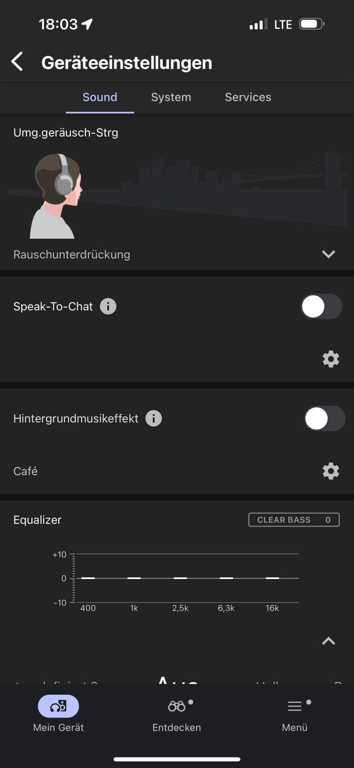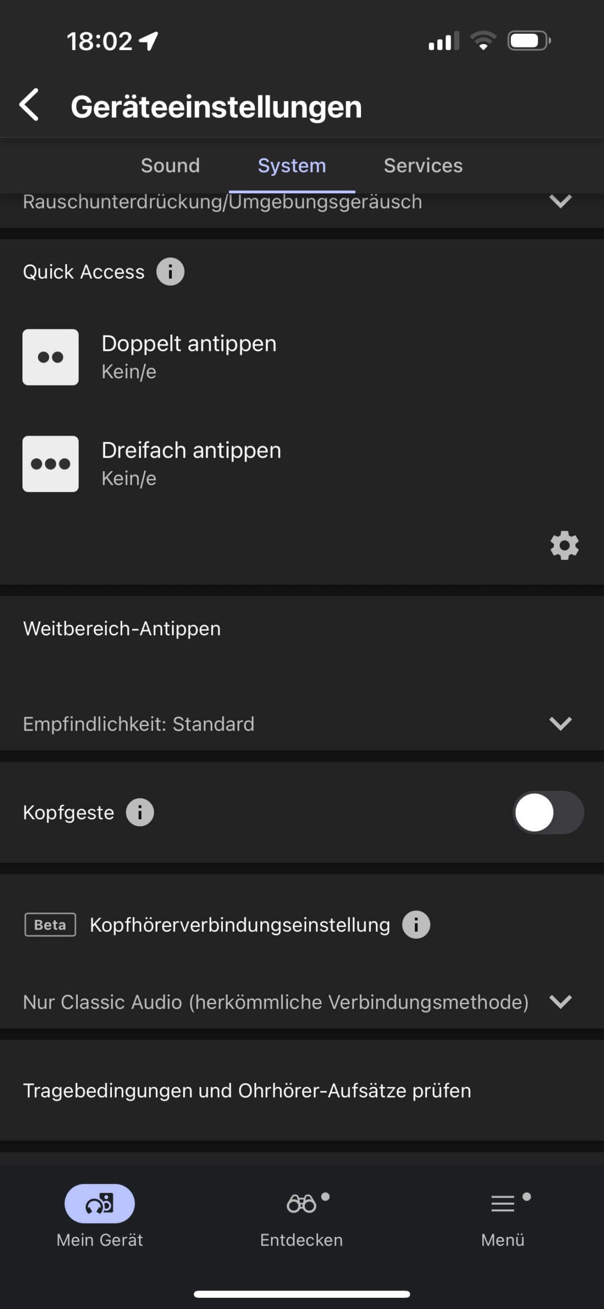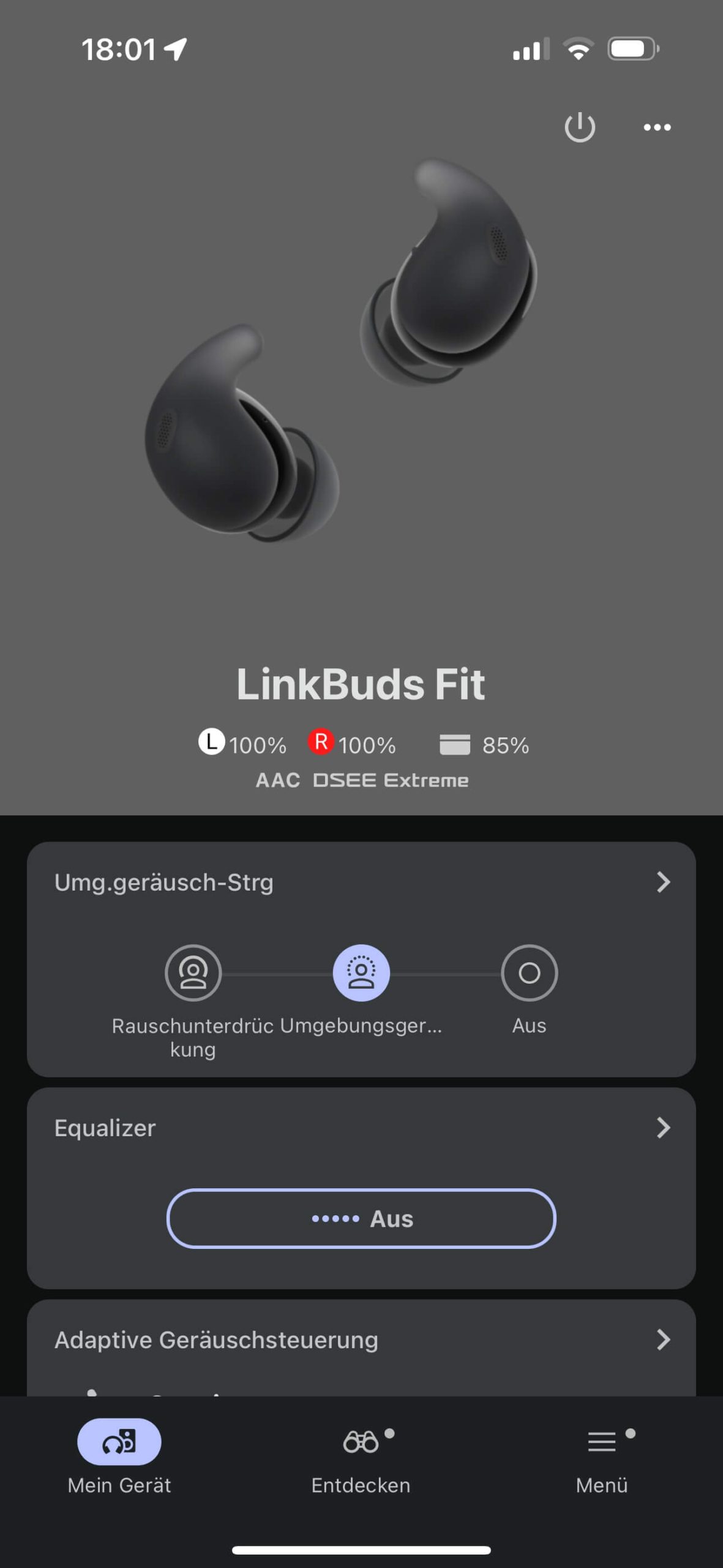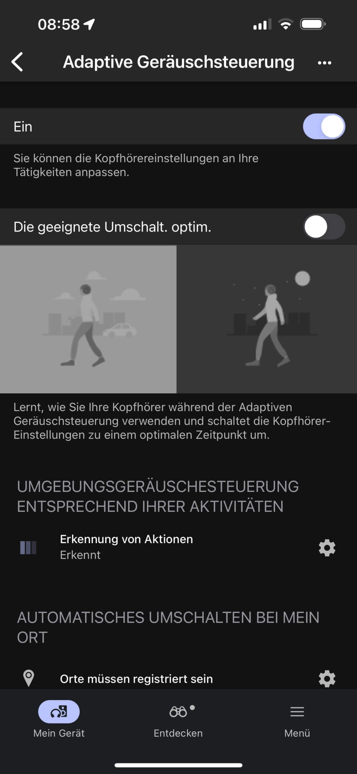 Noise Cancelling und Ambient-Modus sind statisch schaltbar, aber auch über Automatikfunktionen anpassbar. Eine adaptive Geräuschsteuerung soll das Bewegungsmuster und die jeweilige Situation erkennen und bei Bedarf automatisch Anpassungen vornehmen. Dazu ist ein Geo-Tagging möglich und sogar ein lernender Algorithmus implementiert, der das User-Verhalten über die Zeit verinnerlicht. Das ist beeindruckend, teils aber auch verwirrend. Ich selbst bevorzuge bislang die manuelle Umschaltung der Betriebsarten.