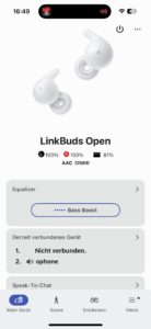 Die App Sound Connect ist unumgänglich, um aus den Sony LinkBuds Open alles herauszuholen. Eine große Menge an Features steht in zahlreichen Menüs verteilt bereit und lädt zu stundenlangem Probieren, Messen und Tweaken ein. Auskunftsfreudig zeigt sich die App schon beim Verbindungsstatus, wo sich mit einem Blick Batteriestand, Codec und Processing erkennen lässt. Im Bereich Equalizer gibt es acht Presets – manche mit blumigen Namen („Hell“, „Begeistert“) und einen 5-Band-EQ mit extra Bassbereich.