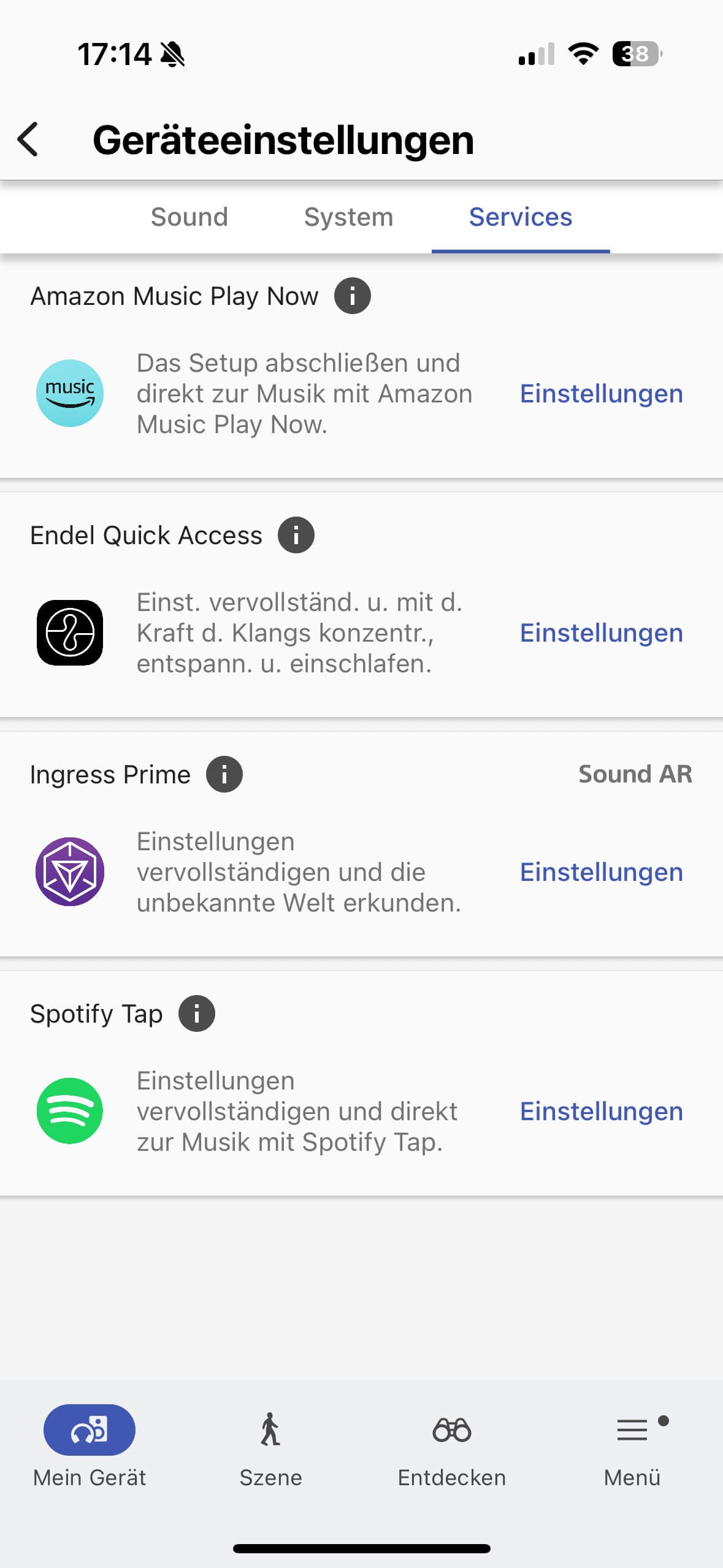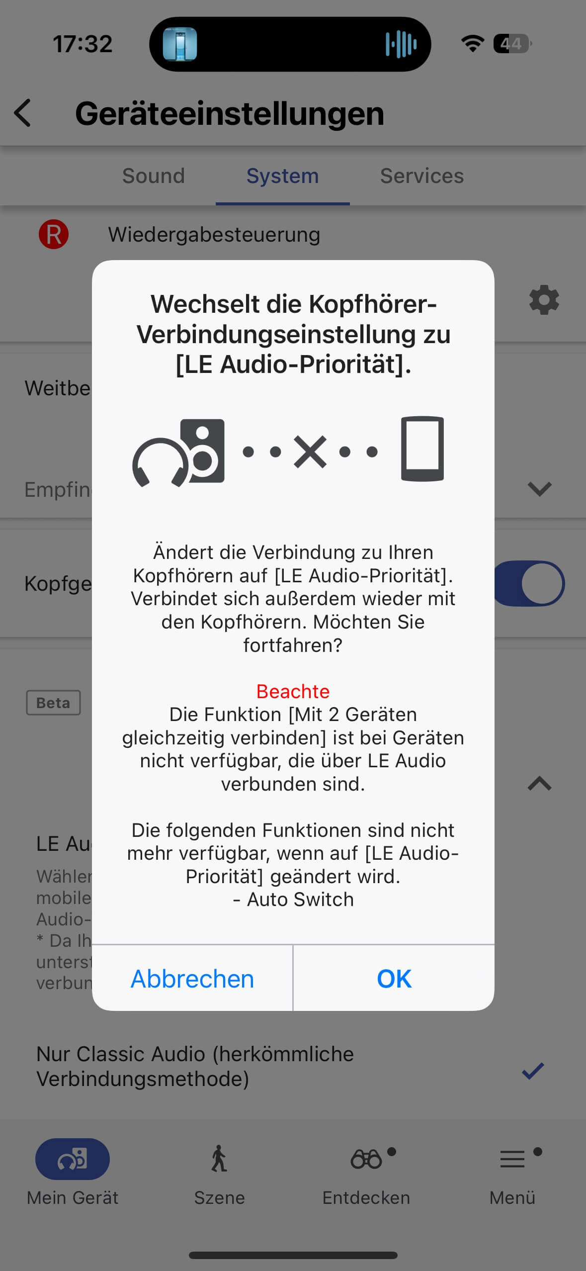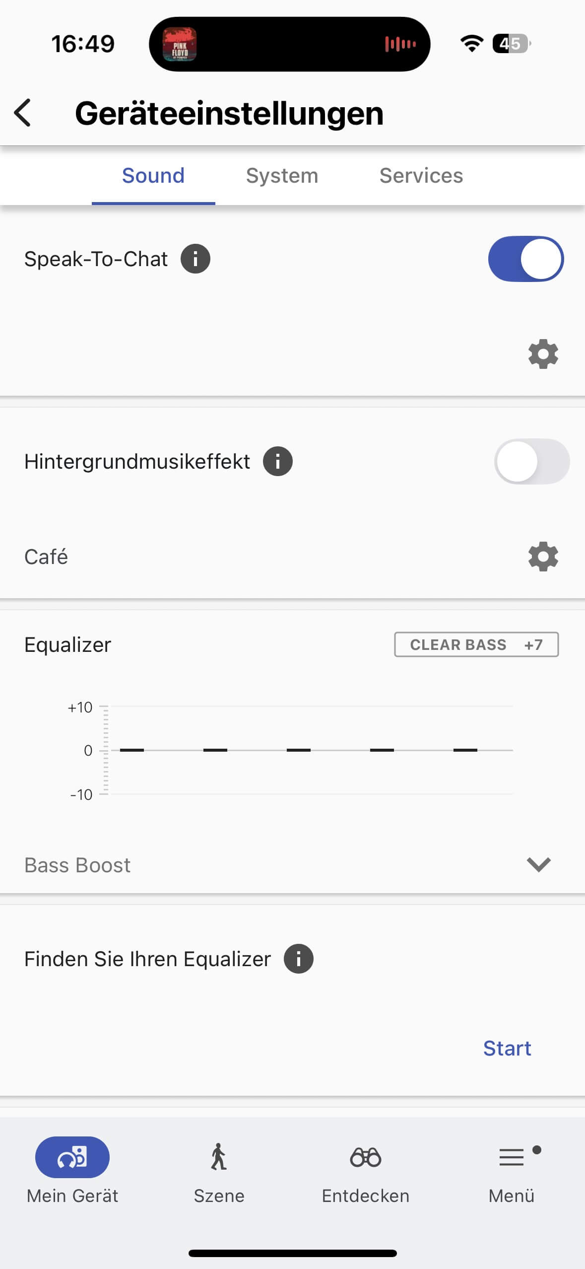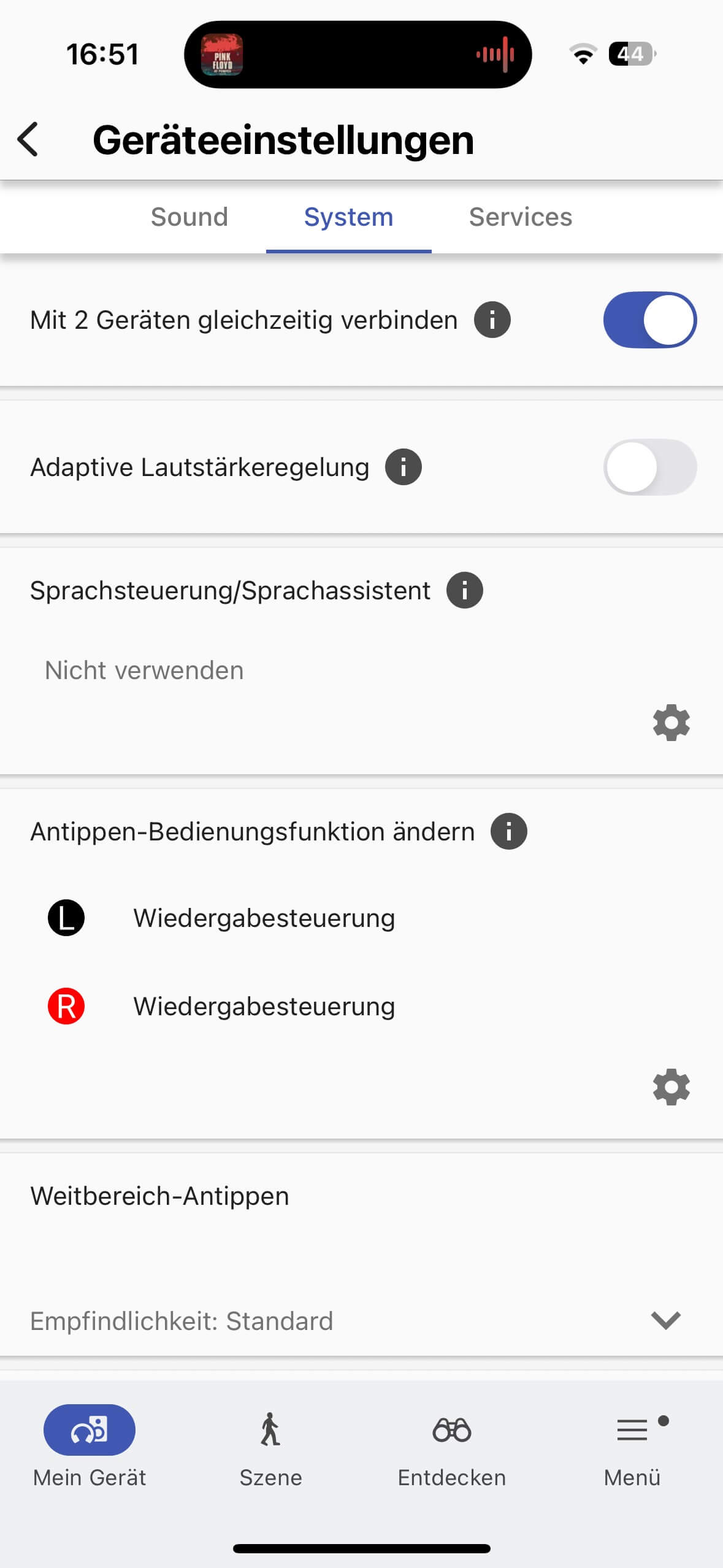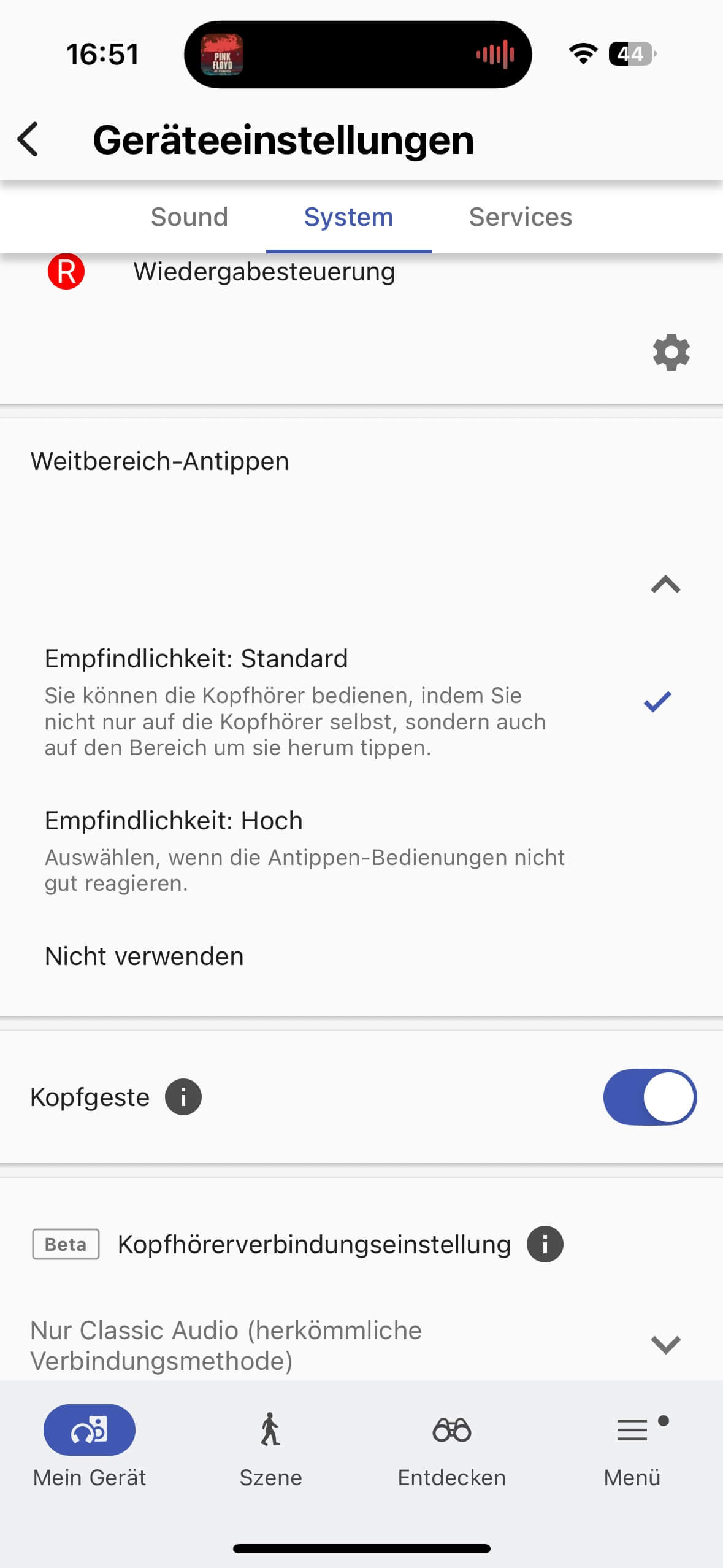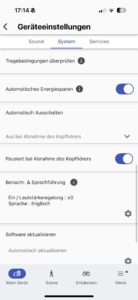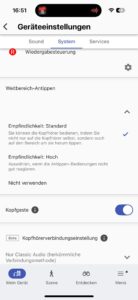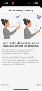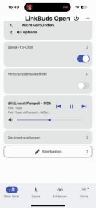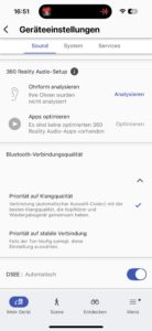 Es gibt einen Hintergrundmusik-Effekt, bei dem die Musik klingen soll, als würde man in einem Café oder im Wohnzimmer sitzen. Darüber hinaus könnt ihr diverse Passformtests und Anpassungen für den 360° Reality Audio Dienst vornehmen, wofür man allerdings entsprechende Anbieter abonnieren muss. Im Bereich „System“ könnt ihr die Multipoint-Funktion schalten, eine adaptive Lautstärkenregulierung aktivieren, die das Volumen der Umgebungslautstärke anpasst und die Remote-Steuerung der Buds anpassen. Da könnt ihr auch festlegen, ob ihr die Knochensteuerung haben wollt oder nicht.