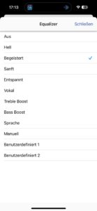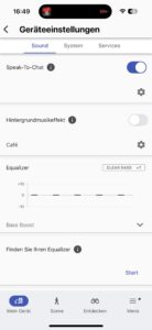 Wer bei den Soundanpassungen Beratung wünscht, kann sich durch Klangvarianten klicken, die dann ein bestimmtes Setup erzeugen. Mit der Funktion Speak-to-Chat unterbricht das Programm, sobald man selbst zu sprechen beginnt – was ganz sinnvoll sein kann, wenn man ein Gespräch beginnen möchte. Apple AirPods Pro 2 User kennen dieses Feature.