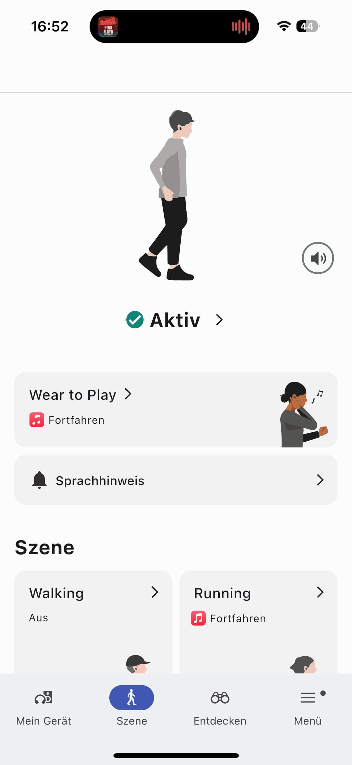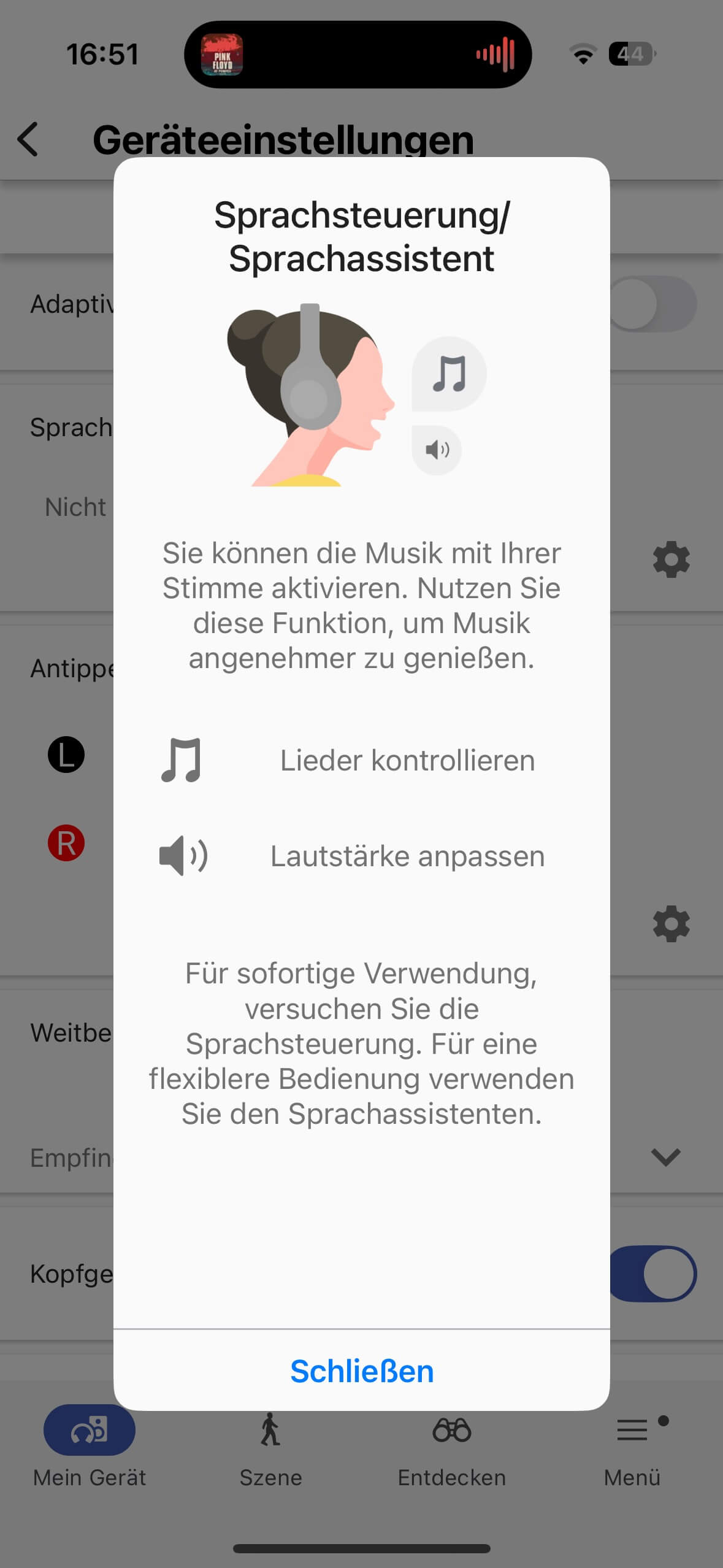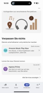 Dann gibt es noch einen Timer, die Pausenfunktion bei Abnahme der Buds und die Möglichkeit, Updates zu verwalten. Im großen Bereich „Szene“ habt ihr dann noch „Scene-Based-Listening“, in welchem die App abfragt, was ihr für eure jeweiligen Aktivitäten an Sound oder auch nicht wünscht. Zum Beispiel: Abspielen einer bestimmten Playlist, wenn ihr joggen geht, oder Stille beim Walken.