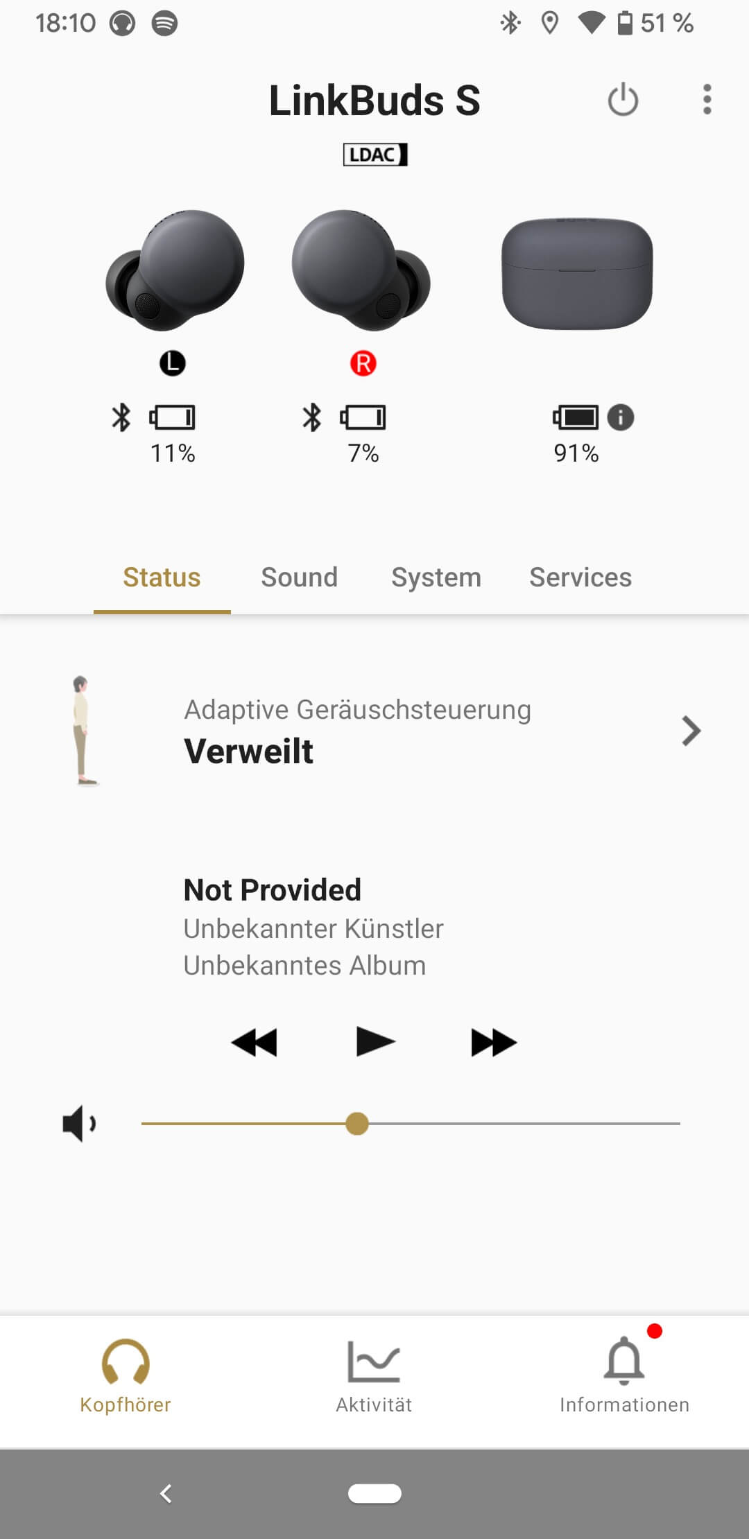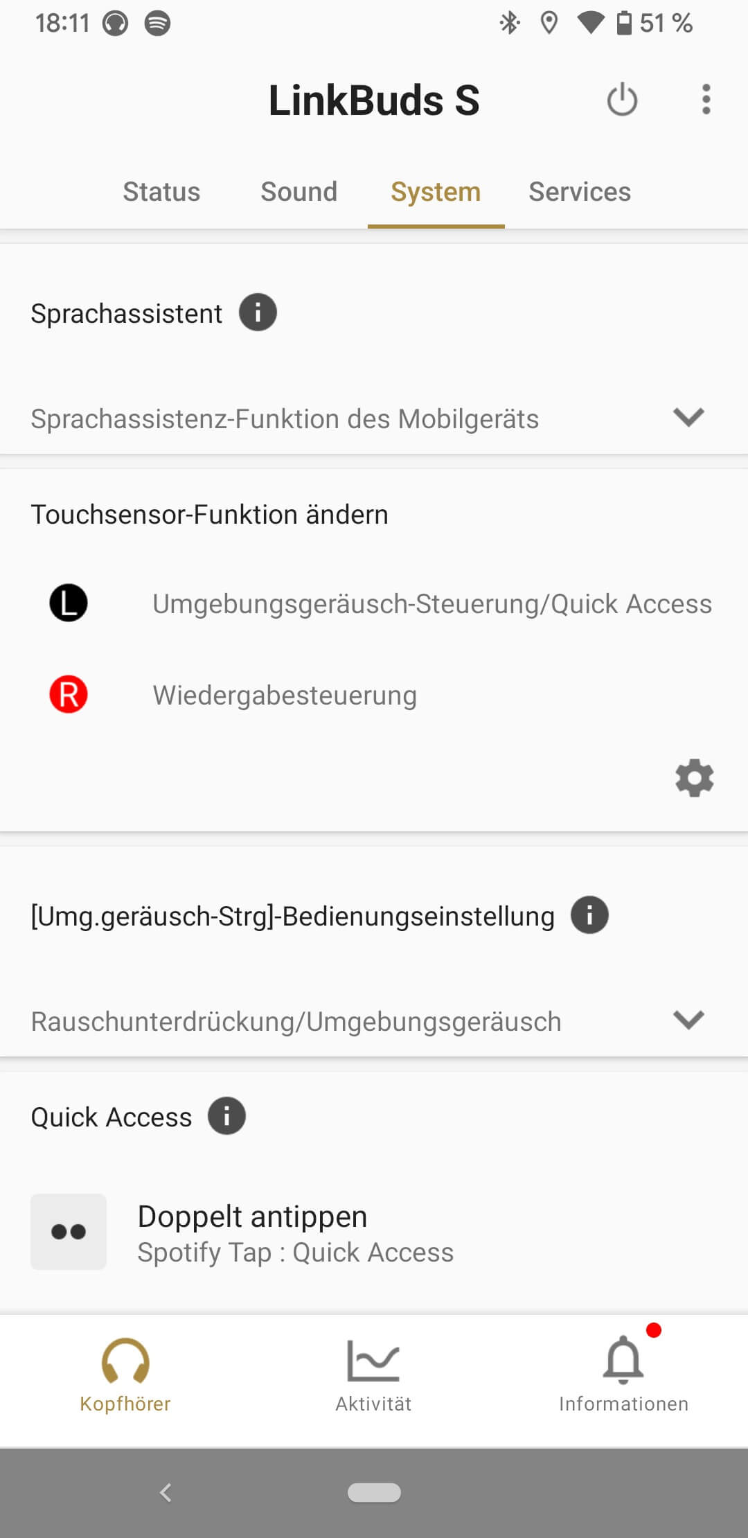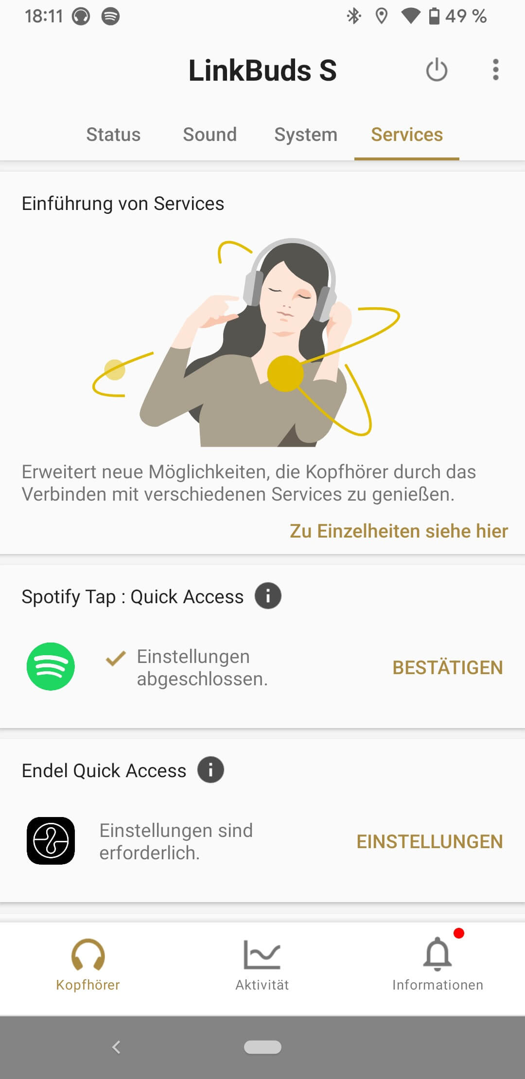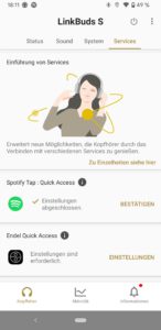 Die Sony LinkBuds S besitzen berührungsempfindliche Touch-Oberflächen zur Steuerung. Links schaltet man zwischen ANC- und Transparenzmodus um, ein Drücken-und-Halten aktiviert den (temporären) Quick-Attention-Modus, einen zusätzlich verstärkenden Umgebungsmodus, der deaktiviert wird, sobald der Finger wieder vom In-Ear genommen wird. Zusätzlich kann man auch durch Doppel- und Dreifach-Taps Titel wechseln oder Anrufe verwalten. Dank Quick Access lassen sich auch Verknüpfungen zu weiteren Apps hinzufügen, die ohne deren Öffnen auf dem Smartphone direkt gesteuert werden können. So kann man beispielsweise Spotify-Playlisten per Tap wechseln, inkl. automatischer Wiedergabe, oder die Soundscapes der Relax-App Endel steuern. Wer letzteren Dienst nutzt, wird sich auch über die Auto-Play-Funktion der LinkBuds S freuen. Diese wurde nämlich so weit angepasst, dass Endel automatisch die eigene Aktivität erfassen kann. Will heißen: Standortabhängig passen sich die Fokus- und Relax-Soundkulissen automatisch an die Umgebung an.