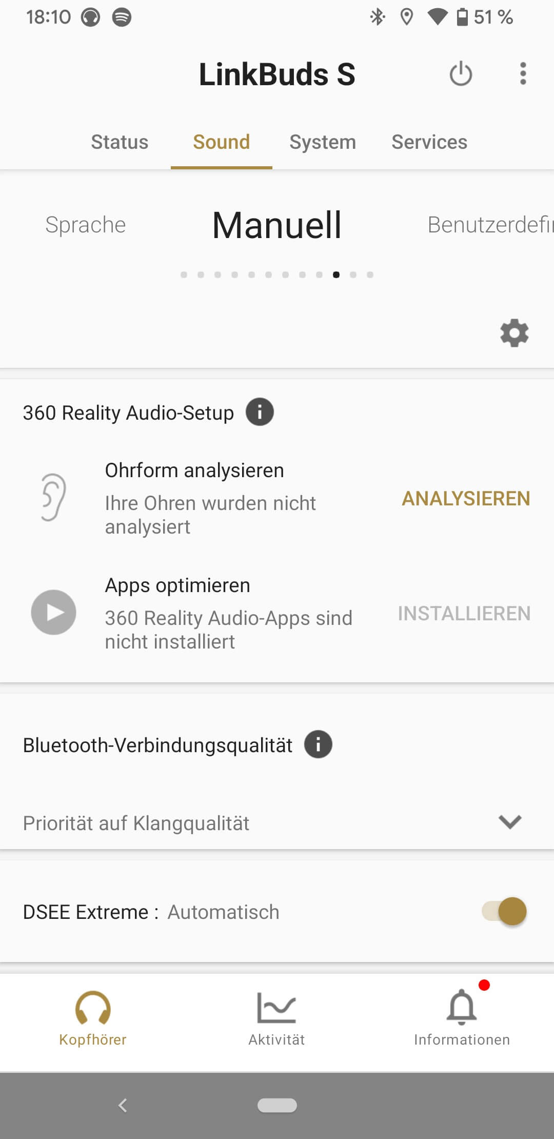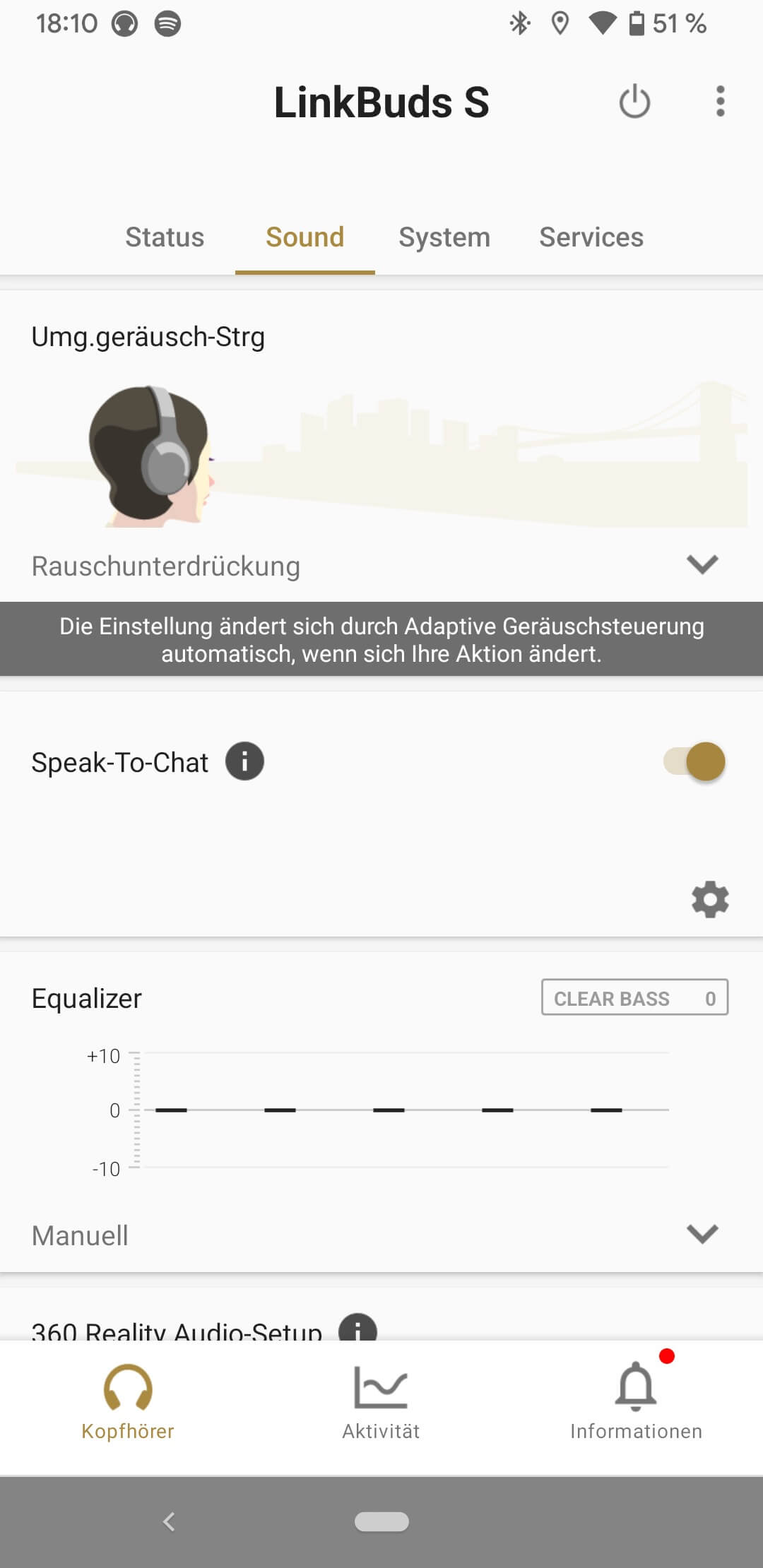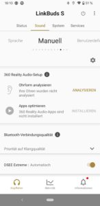 Das wird besser, wenn Produktionen im 360-Reality-Audio-Format gehört werden. Entsprechend kodierte Mixes (Tidal, Deezer) vorausgesetzt, schaffen es die Sony LinkBuds S, das Panorama in einem virtuellen Raum dreidimensional im Kopf zu verteilen, sodass eine weitaus realistischere Vorne-Hinten-Ortung nebst Höhendarstellung erreicht wird, als bei reinen Stereo Tracks. Zwar können alle Kopfhörer immersives Audio wiedergeben, Sony passt seine Kopfhörer aber speziell an, was in der App durch Fotografieren der eigenen Ohren entsprechend angestoßen werden muss. Das daraus generierte Hörprofil erweitert die Räumlichkeit, an den Klang muss man sich gewöhnen, da Druck und Direktheit flöten gehen.